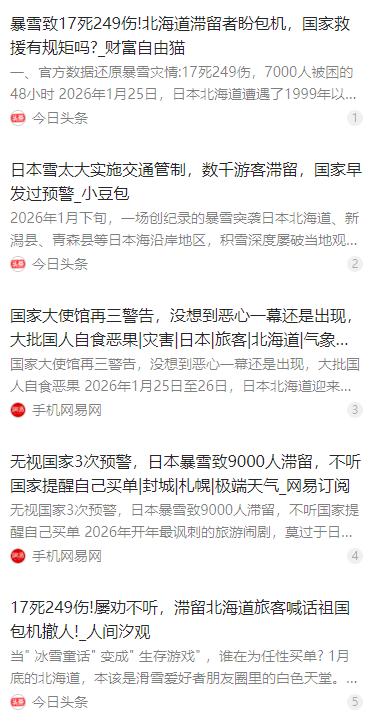 看到网上流传的同胞大量滞留日本机场的消息,有人站出来大喊扎心,说网友们太冷漠。可说实话,网友们看到那些图片的第一反应,真的是扎心吗?我看未必,多半心里藏着点幸灾乐祸的情绪。   麻烦看官老爷们右上角点击一下“关注”,既方便您进行讨论和分享,又能给您带来不一样的参与感,感谢您的支持!   最近网上流传大量同胞滞留日本新千岁机场的消息,不少人站出来说网友太冷漠、不心疼同胞。但说实话,多数人看到现场画面的第一反应,未必是扎心,更多是觉得这些人是自己选择的结果,谈不上无辜。   2026 年 1 月下旬,日本北海道遭遇 1999 年以来最强暴雪,日本气象厅提前发布高等级暴雪预警,提示这是近二十多年少见的极端降雪过程,多地交通与民生都将受严重影响。   从 2025 年 11 月开始,中国外交部、驻日使领馆就多次发布安全提醒,明确提示日本冬季极端天气风险、滑雪场安全隐患,临近暴雪时更是反复强调谨慎前往北海道,减少非必要外出。   中外多方预警层层叠加,可仍有不少中国公民执意赴北海道旅游、滑雪,把官方提醒当成耳旁风。有人专门冲着雪景与滑雪项目前往,明知天气风险仍不愿改变行程。   更让人揪心的是,部分游客无视滑雪场规则,擅自闯入禁止进入的野雪区域。1 月 25 日,6 名中国男子不听工作人员劝阻,进入新潟县八海山滑雪场 “死亡谷” 野雪区,最终被困近 20 小时。   这场极端暴雪直接导致新千岁机场大量航班取消,约 7000 名旅客滞留,其中中国游客占比较高。机场内交通瘫痪、物资紧张,不少人只能席地而坐,餐饮与保暖物资短缺,处境十分狼狈。   表面上看是暴雪天灾,本质上是无视预警与规则的人祸。如果能重视官方提醒、遵守场地规定,很多人完全可以避开这场危机,不用陷入进退两难的境地。   社交媒体上能看到,部分滞留者出发前曾高调晒行程、炫耀旅行,甚至嘲讽提醒他们注意安全的人,觉得对方小题大做、杞人忧天。这种前后反差,也让网友很难产生共情。   他们的任性不仅让自己陷入困境,还占用了大量公共资源。机场运转压力剧增,中日救援力量要分出精力处理滞留与被困事件,消耗本可用于更紧急情况的人力物力。   网友没有一味同情,不是冷漠,而是清楚风险与后果的对应关系。出境旅行本应做好风险评估,尊重当地规则,更要重视祖国发出的每一次安全提醒,这是对自己负责,也是对他人负责。   护照带来的是危难时的保障,不是无视规则、肆意冒险的通行证。真正的安全,从来不是出事之后等救援,而是提前规避风险、守住底线,不拿自己与他人的安稳当赌注。   这次事件也给所有人提了醒:理性出行、敬畏规则,不是一句口号。境外旅游要时刻关注官方预警,不闯禁区、不抱侥幸,别让一场本该愉快的旅行,变成消耗公共资源、让自己狼狈不堪的麻烦。   出门在外,平安永远是第一位的。重视提醒、遵守规则、理性规划,既是保护自己,也能避免给家庭、社会添负担,更不辜负祖国在海外为公民安全所做的每一份努力。