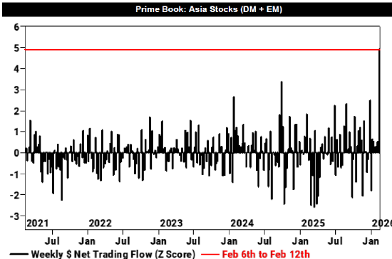 上周,对冲基金对亚洲新兴和发达市场的净买入规模创下高盛PrimeServices交易台自2016年开始追踪该数据以来的最高纪录,该地区受益于市场对人工智能基础设施企业的乐观预期。