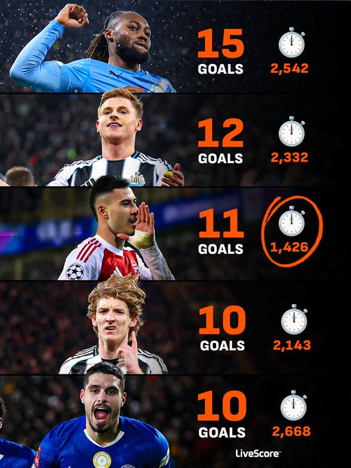 虎扑02月16日讯LiveScore数据统计,只有5位英超边锋球员在本赛季各项赛事中打进至少10粒进球,他们是:
