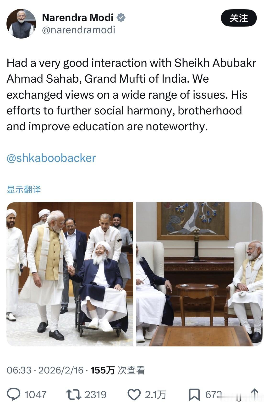 印度总理纳伦德拉·莫迪与印度大穆夫提(Grand Mufti)谢赫·阿布巴克尔·艾哈迈德·萨哈布(Sheikh Abubakr Ahmad,亦称 Kanthapuram A.P. Aboobacker Musliyar)刚刚进行了非常愉快的交流。双方交换了意见,探讨了广泛的议题。莫迪称赞了对方促进社会和谐、兄弟情谊和改善教育所做的努力。 谢赫·阿布巴克尔·艾哈迈德作为印度逊尼派穆斯林社区的重要领袖,其与莫迪的交流通常被视为印度政府促进国内社群对话及处理伊斯兰世界关系的一部分。 在印度,“大穆夫提”(Grand Mufti of India)是印度穆斯林社区中极具影响力的最高宗教权威头衔。与一些政教合一国家由政府任命的官员不同,印度的这一职位具有以下独特性质: 职位性质: 这是一个荣誉性头衔,并非由印度政府官方授予或认可的行政职务。它代表了宗教领袖在穆斯林社群内部的至高威望。 选拔方式: 传统上,大穆夫提由印度的宗教圣哲和学者(Ulama)选举产生,通常代表了占印度穆斯林多数的逊尼派(巴雷尔维教派)。 核心职责: 发布教令(Fatwa): 就伊斯兰教法、宗教事务及社会问题提供权威解释和法律意见。 社会领导力: 代表穆斯林社区与政府(如莫迪总理)进行高层对话,协调宗教和谐、少数群体福利及国际人道主义事务。 慈善与教育: 现任大穆夫提通常管理着庞大的教育网络。例如现任大穆夫提在喀拉拉邦领导着现代化的教育城项目。 现任者: 谢赫·阿布巴克尔·艾哈迈德(Sheikh Abubakr Ahmad,亦称 Kanthapuram A.P. Aboobacker Musliyar),他于2019年2月在德里举行的正式集会上被确认为印度第十任大穆夫提。 虽然不具备世俗法律权力,但大穆夫提在调解国际法律纠纷(如涉及印度公民在国外的司法救济)和维护国内宗教团结方面发挥着不可替代的作用。
