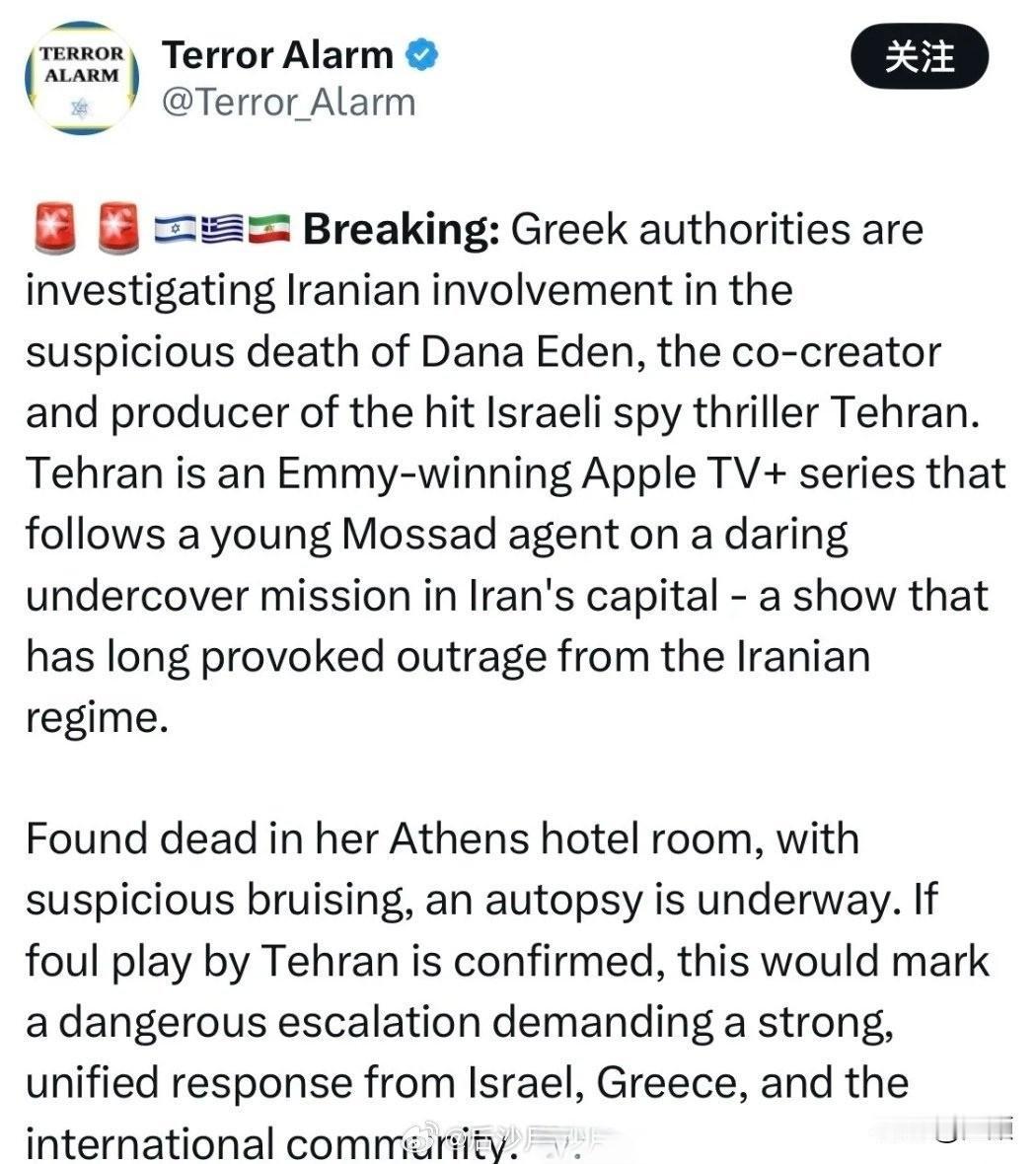以色列爆款谍战剧《德黑兰》,2021年获国际艾美奖最佳剧集(以色列首部)。该剧核心设定为伊朗裔犹太女特工潜入德黑兰,破坏伊朗核计划、对抗革命卫队。剧中伊朗被塑造成封闭、高压、反西方;只有“亲以内鬼”才是正面角色。而摩萨德=正义、伊朗官方=反派,亲以反伊叙事明显,伊朗官方定性为西方宣传工具。 2026.2.15,该剧52岁制片人达娜·伊登在雅典一酒店房间死亡,希腊警方初步判定自杀,现场有大量药物、颈部/手部有淤伤,她当时在雅典拍《德黑兰》第四季。 以色列媒体质疑淤伤,怀疑谋杀/他杀。 制作方否认政治暗杀、伊朗报复等传言,称无证据。 拍了三季摩萨德斗伊朗的谍战剧,制片人自己死成了第四季剧本。谍战黑幕、现实比剧情更疯。