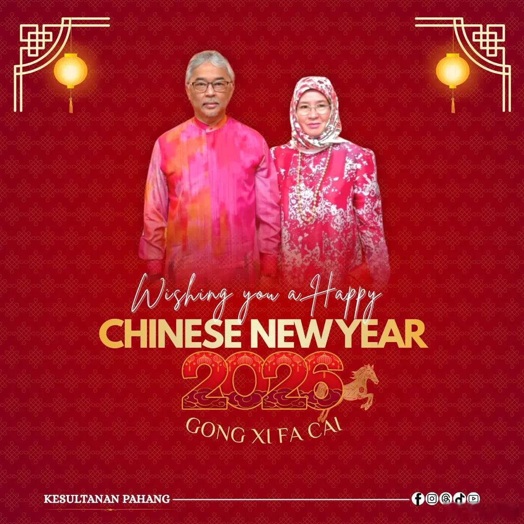 马来西亚王室 🇲🇾2月16日,彭亨州苏丹阿卜杜拉·沙阿和王后阿兹赞祝福中国新年快乐。🇨🇳🧧苏丹夫妇向彭亨州和全国各地的华裔表达节日的问候,两位殿下都希望中国的新年将和家人和朋友在充满欢乐、繁荣和幸福的气氛中庆祝。愿这个中国新年带来欢乐、持久的健康,进一步加强彭亨州和整个马来西亚的团结与和谐精神。世界各国王室也祝彭亨王室节日快乐~