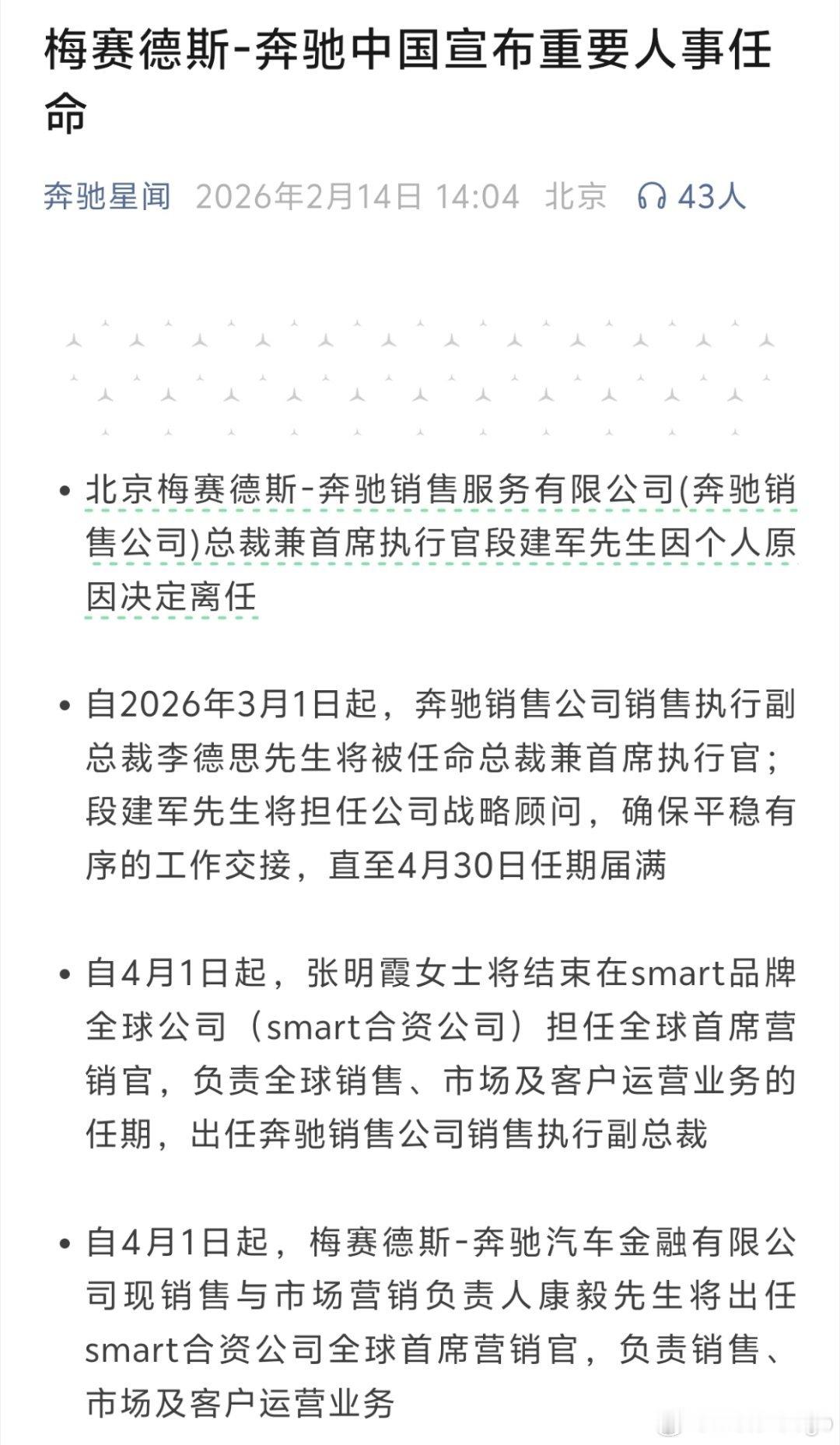 奔驰中国的大调整,张明霞也即将从 smart 回到奔驰。大v聊车