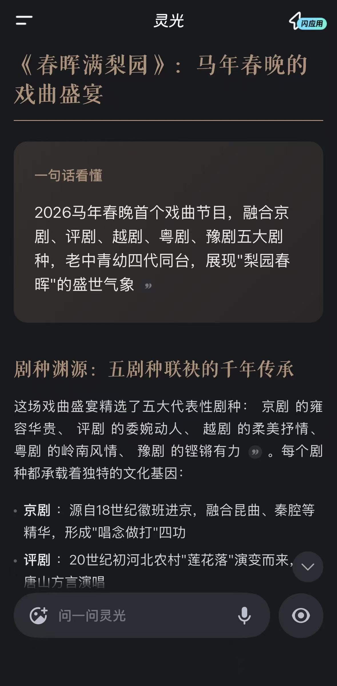我的马年抓马之旅 陪奶奶看戏曲《春晖满梨园》,奶奶指着电视问我这个选段是哪个剧种、有什么来头,我用灵光实时查完,从流派渊源到唱词典故,连演员的艺术生涯都讲得明明白白,奶奶直夸我现在懂的比戏班子里的人还多。灵光带你去抓马