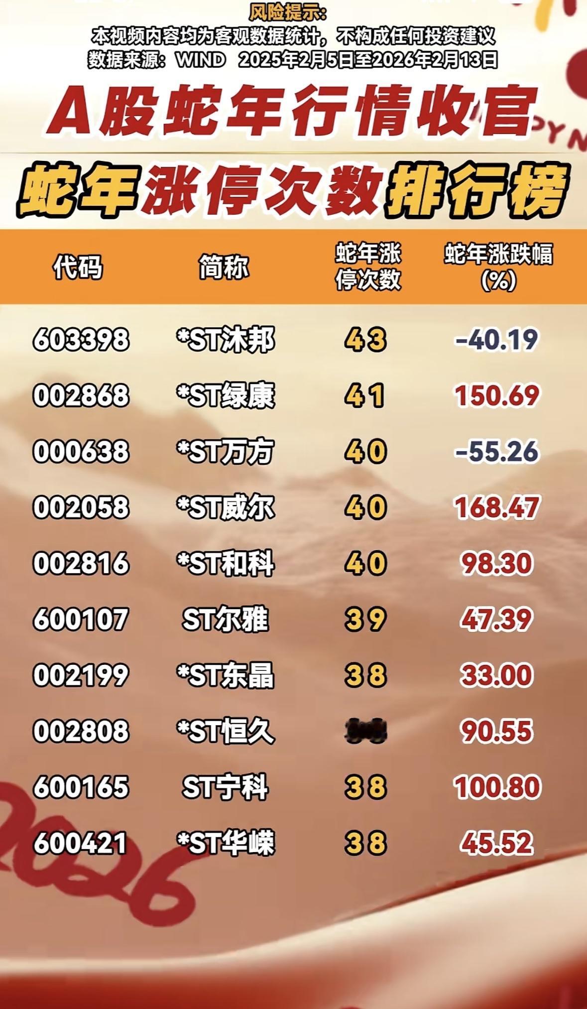 A股蛇年行情收官,涨跌停数排行榜新鲜出炉!收官日2026年2月13日,市场一片惨绿,上证指数失守4100点,创业板指跌幅最大。个股普跌,3829只跌,1540只涨,涨停46家、跌停16家。 不过,蛇年全年可是妥妥的大牛市。上证指数涨了25.58%,创业板指领跑,涨58.73%,科创综指最强,涨64.20%,日均成交较龙年增近70%。4788只个股上涨,近9成飘红,869只实现翻倍。像上纬新材、天普股份、嘉美包装这些重组概念牛股,涨幅都超800%。 现在大家都在琢磨,蛇年领涨的赛道,马年还能继续牛吗?让我们拭目以待!