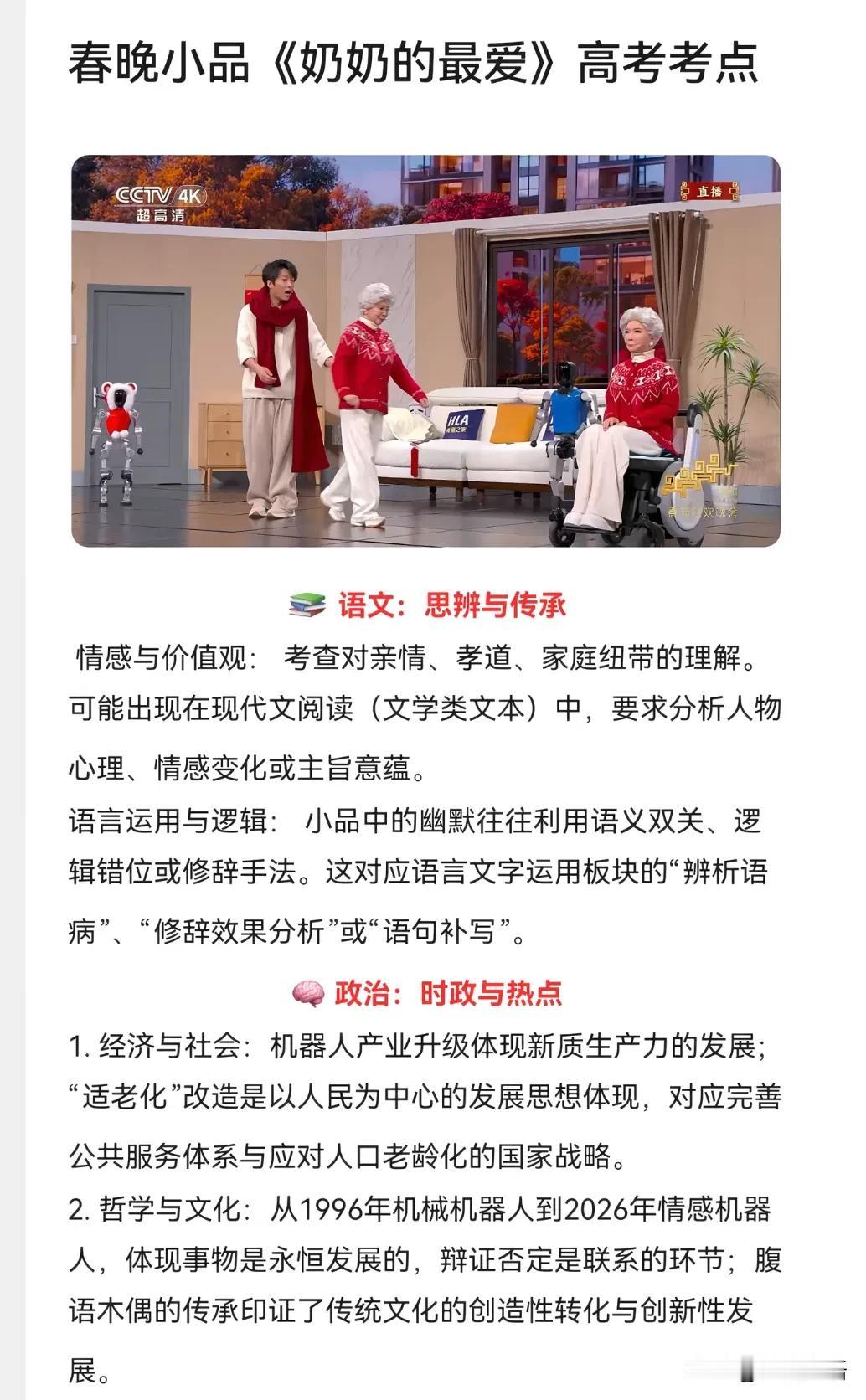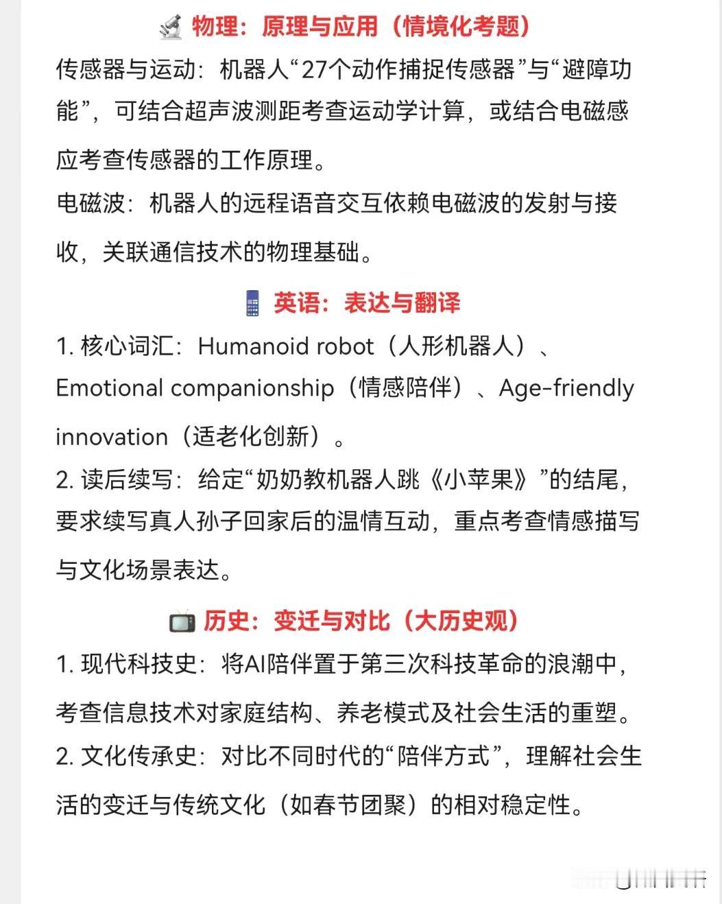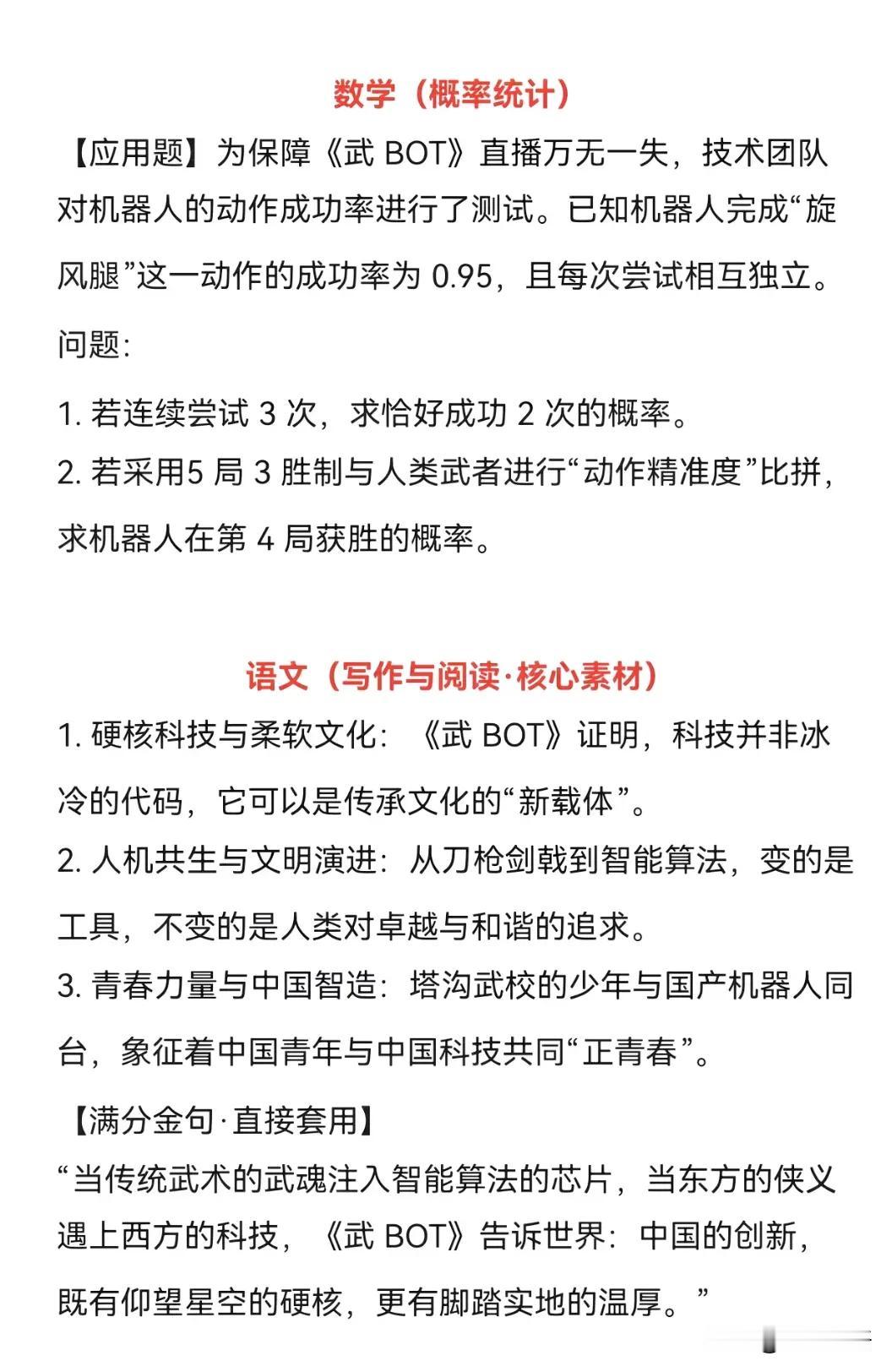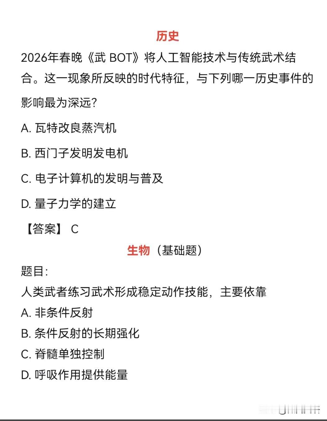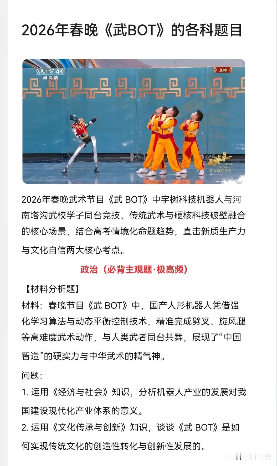 【新鲜出炉!26春晚考点】都是豆包出的题目吧!河北版本的模仿版!中考,高考试卷!新鲜出炉啦! 先有物理试卷:(5分)在2026年春晚中,宇树科技的机器人再次惊艳世界!已知一个机器人他的质量为55kg,一只脚与地面接触面积为55平方厘米,请回答以下问题 (1)机器人的重力为多少(g=10N/kg) (2) 机器人对地面的压强是多少? 太厉害了!还有道法题目! (请大家做一道送分题)2026年央视春晚将人工智能、数字技术与传统戏曲、武术、歌舞等中华文化元素深度融合,打造出富有科技感与东方美学的舞台效果,让观众感受到传统文化的全新魅力。这一做法有利于() ①推动中华优秀传统文化创造性转化、创新性发展 ②增强文化自信,延续文化血脉 ③弘扬以改革创新为核心的民族精神 ④满足人民群众日益增长的精神文化需要 A. ①②③ B. ①②④ C. ①③④ D. ②③④ 太强了!这届网友太强大了! 写拜年语送祝福春晚高考 马年春晚机器人 春晚机器人模仿 信息图片来源网络侵权联删