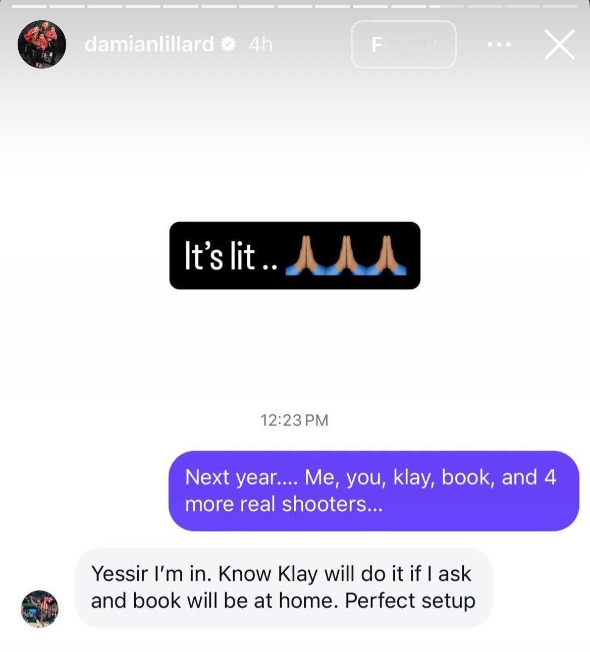 利拉德晒出和库里聊天记录——利拉德:“明年,我和你,克莱,还有布克,再加上4个其