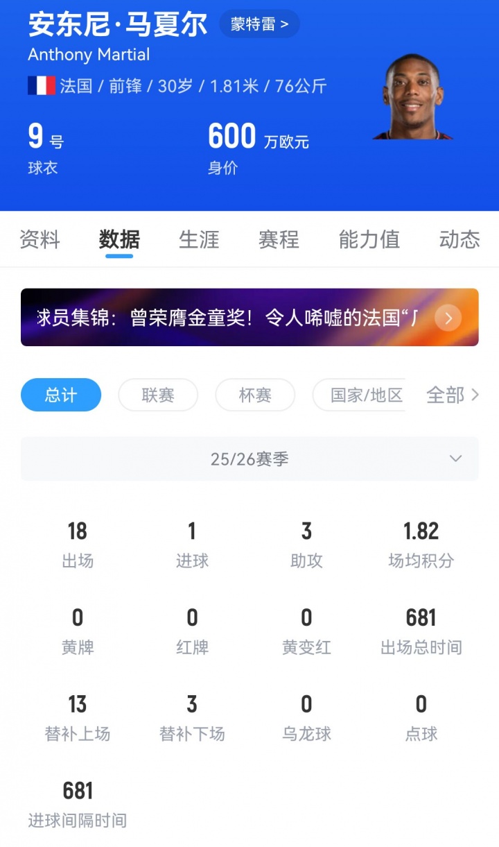 现年30岁的马夏尔去年夏窗从雅典AEK转战墨西哥球队蒙特雷,效力至今为球队出场18次,贡献1球3助攻。