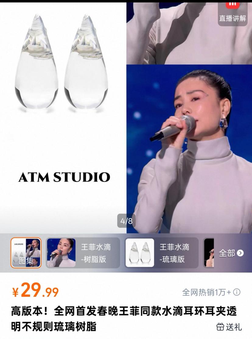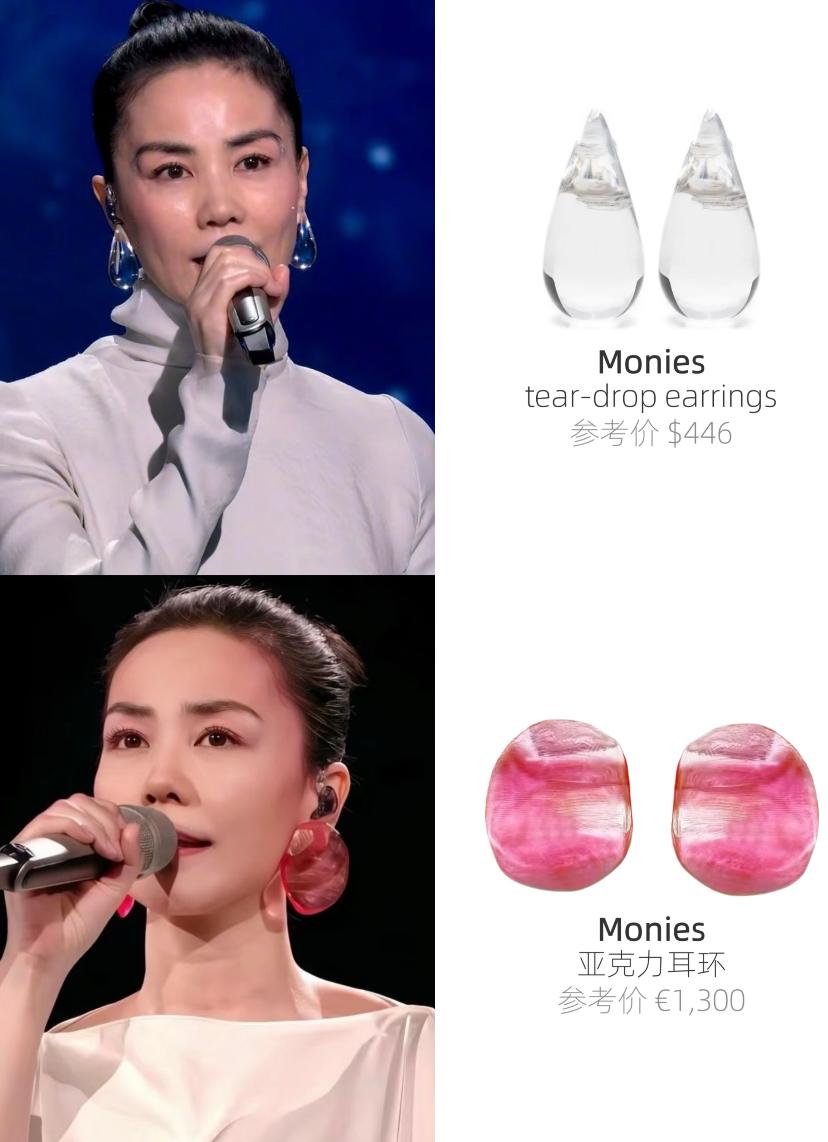 王菲唱歌时戴的大耳坠实在太抢镜了 起初我还纳闷,这耳坠真的好看吗,这么大这么沉,戴着不难受吗? 结果一查才发现,好家伙,原来这是国外知名品牌,亚克力材质,也就是塑料,正版居然要2000多。 经王菲这么一戴,某宝仿款直接卖出1W +。 想想去年她带火了虾片款,今年又带火水滴款,这带货能力实在太强了。 不过我觉得虾片款还挺有特色,火了也正常,可这水滴款,实在是欣赏不来啊。 这么大又重的耳坠,真有人会日常佩戴吗? 只能说时尚的世界我不懂,但王菲的带货实力我是服了。