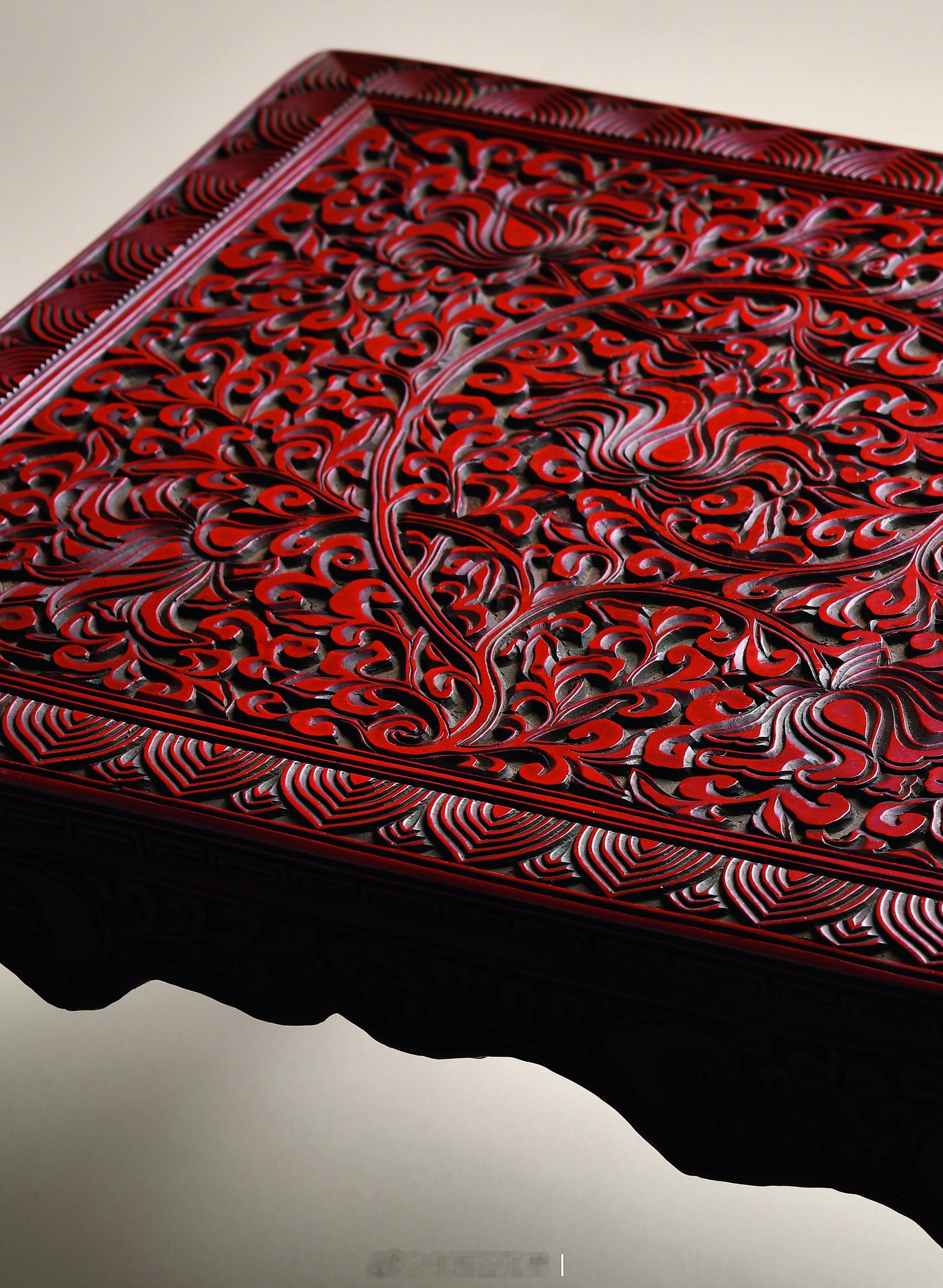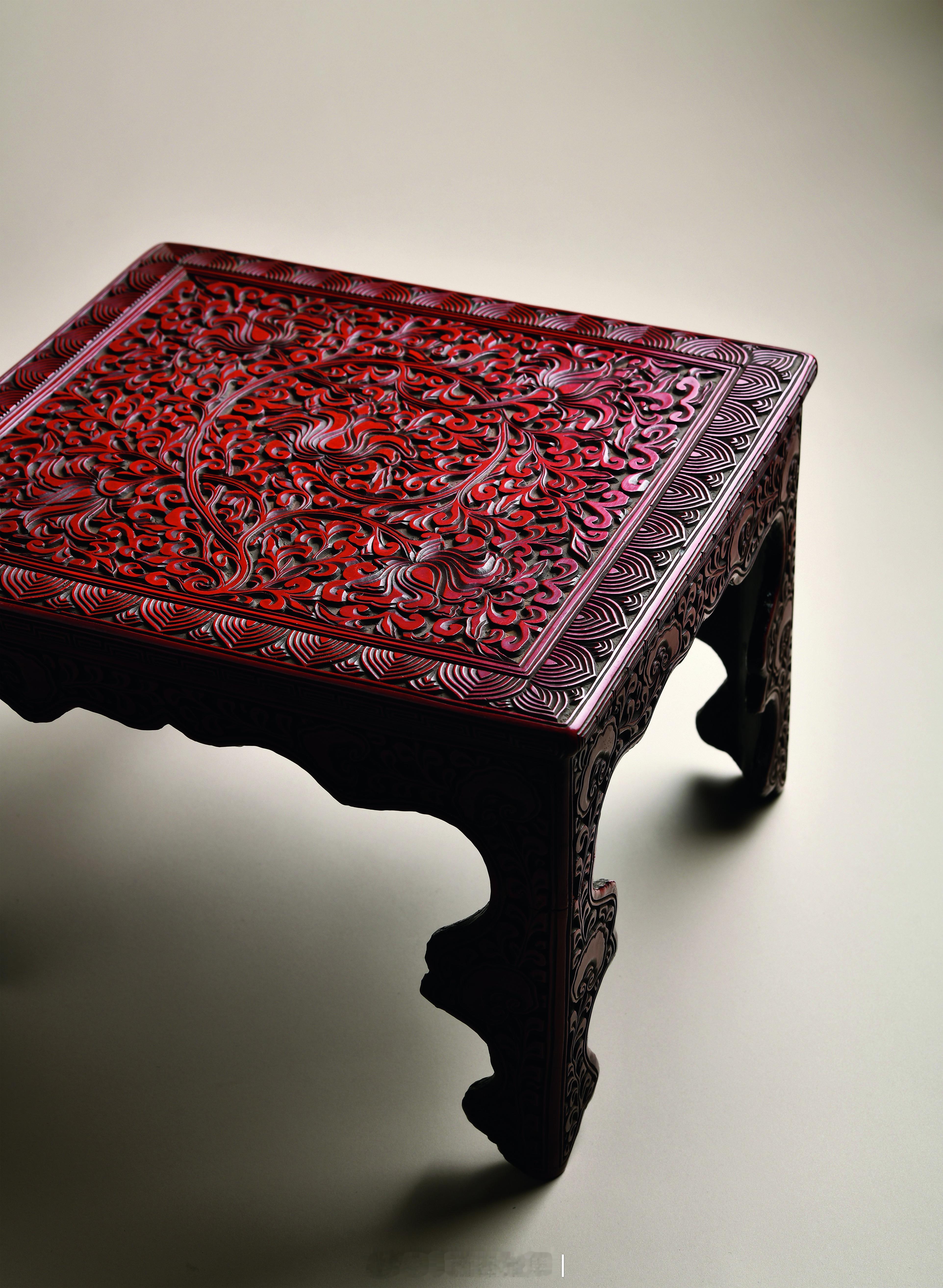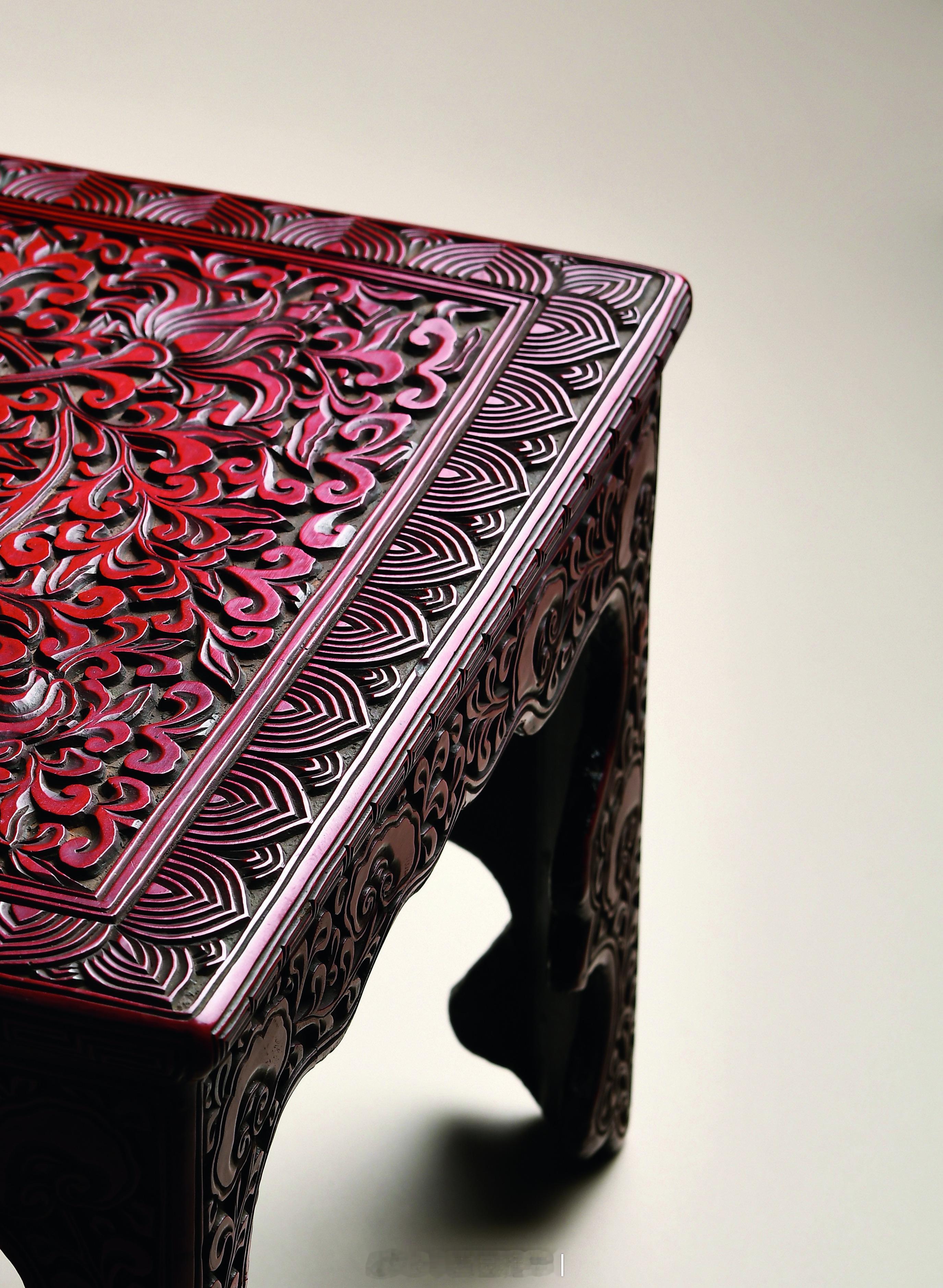 来源:豐臣秀吉養子松平秀康之後的雲州松平家舊藏(根据盒签)箱盒带题字:推朱卓 曾祖父六代目三岛佐次右卫门 松秀 明治初年 松平家 より 拜领 昭和已已师走(十二月)十四日 松秀案几以木为胎,通体外表通体髹饰朱红大漆辅以剔红手法镌雕而成。长方形桌面,四周围以莲瓣形框,框内剔雕宝相花及蔓草纹,纹饰布局繁缛细密。面缘突出外侈,剔刻回纹一周。面下四角设有四直立足,相对的腿足设有壸门,颇具唐代榻几风韵。四足外壁同时有剔红的蔓草纹。桌底及四足内面髹饰黑色大漆,甚为庄重。唐代以前,汉人均席地而坐,至唐代出现低矮的垂足家具,由于唐代佛教盛行,在这些家具上也设有佛龛的某些装饰图案及样式。此件剔红案几造型端正,木胎攒装牢靠,体表漆层厚重,纹饰繁复刻工不厌其烦,精细而一丝不苟。尤腿足壸门类似锯齿造型,极见造型及髹饰剔刻功力。体现了明代剔红家具高超的雕漆工艺。