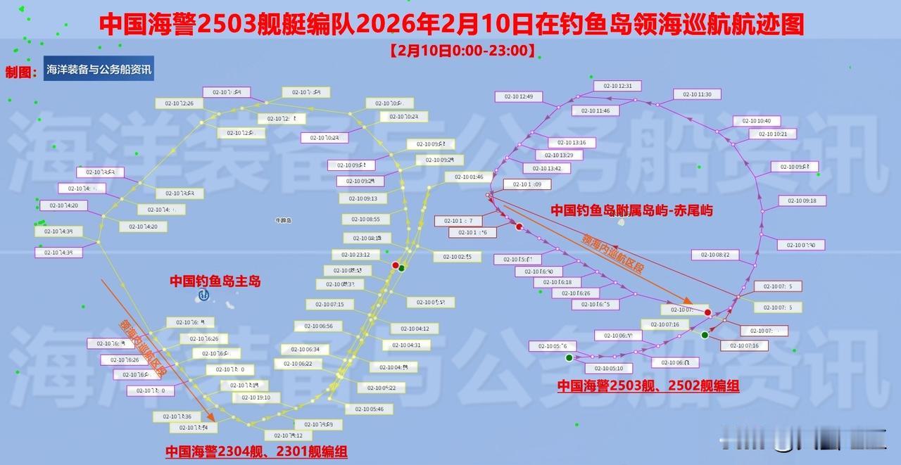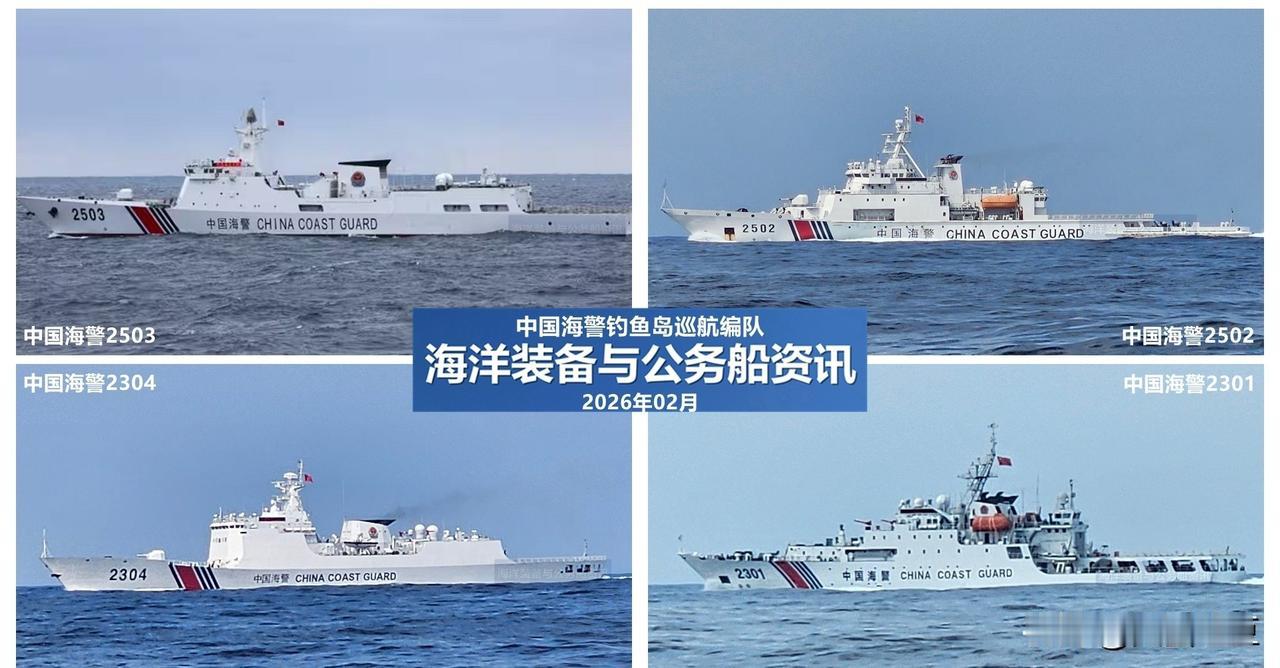 【海警】首次双岛领海同时巡航。2026年2月10日,中国海警2503舰艇编队在我钓鱼岛领海内巡航。北京时间当天下午15时许,中国海警2304与2301舰编组在中国钓鱼岛主岛西侧领海、中国海警2503和2502舰编组在我赤尾屿西侧领海内同时巡航,持续至当日下午17时许,连续巡航约2个小时。这是自2012年9月14日以来,特别是中国海上维权执法力量在我钓鱼岛开展常态化维权巡航以来,中国海警首次在钓鱼岛主岛和赤尾屿领海内同时开展维权巡航行动。钓鱼岛领海 钓鱼岛执法 中国海警船