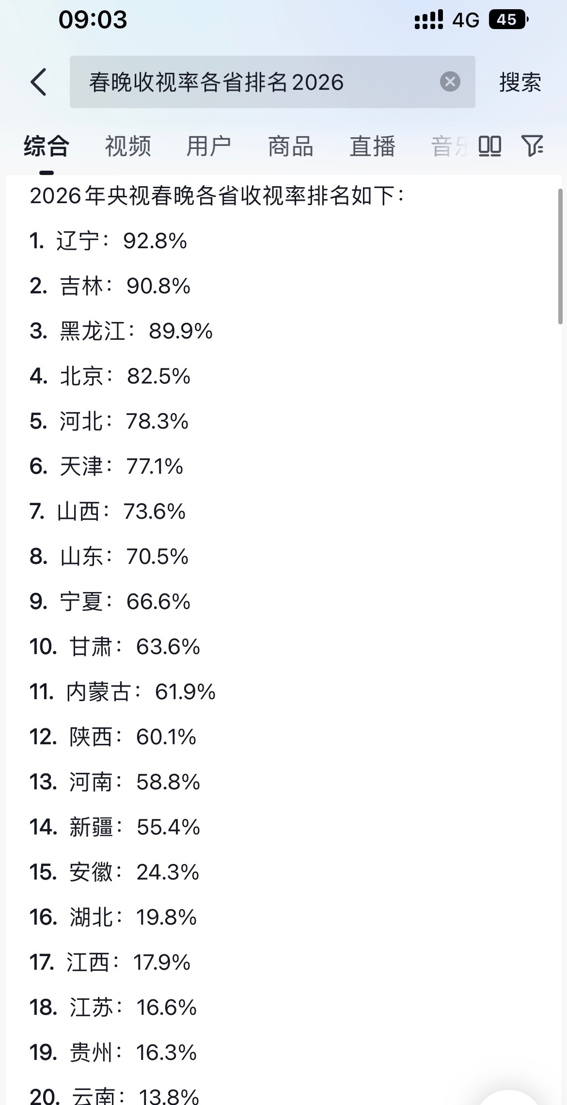 春晚收视率10几年我还是看春晚的,后来还关注下节目,放着当背景音乐,昨天春晚还没开始,电视都关了,有一样的么?坐标浙江 春晚收视率各省排名2026
