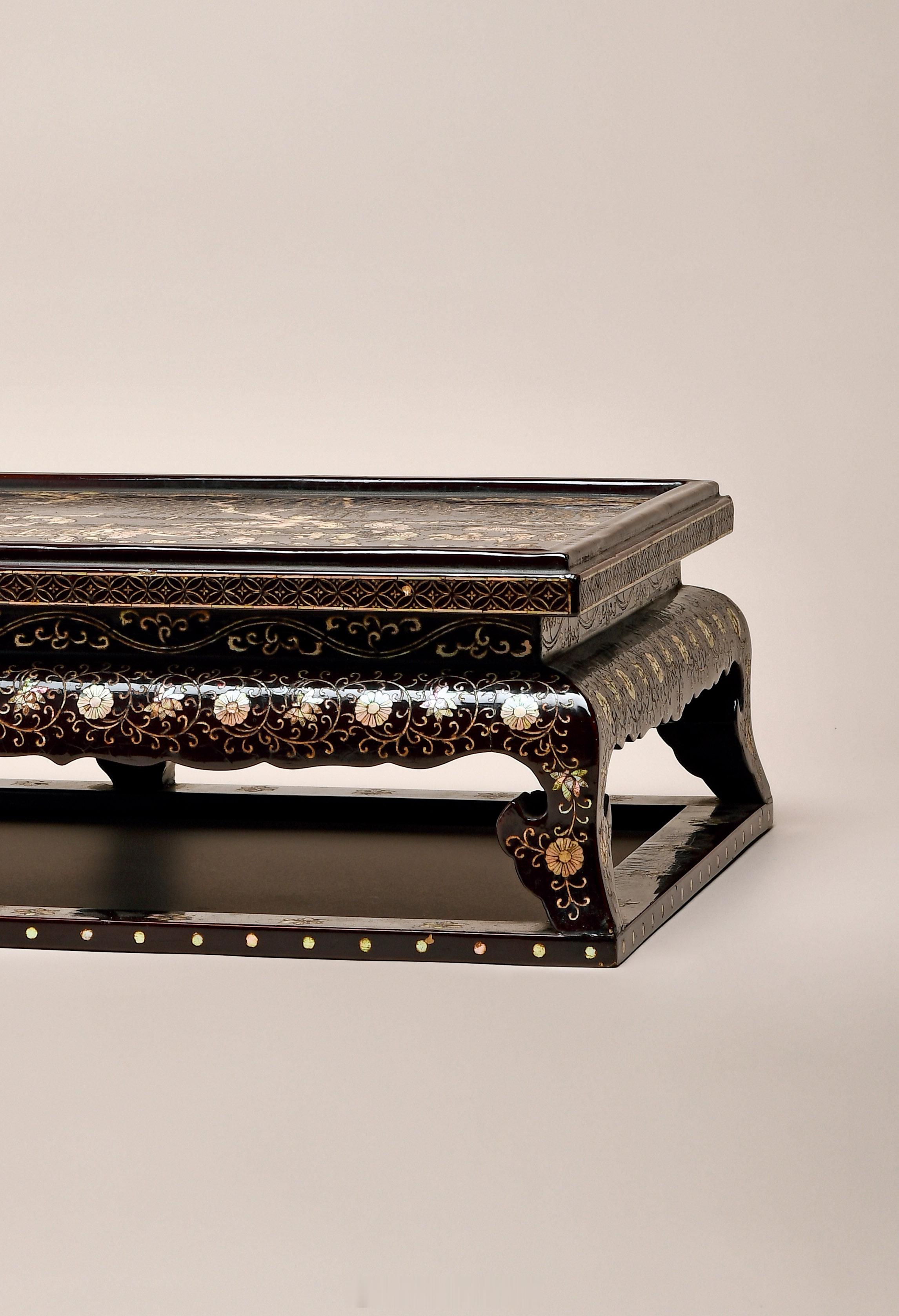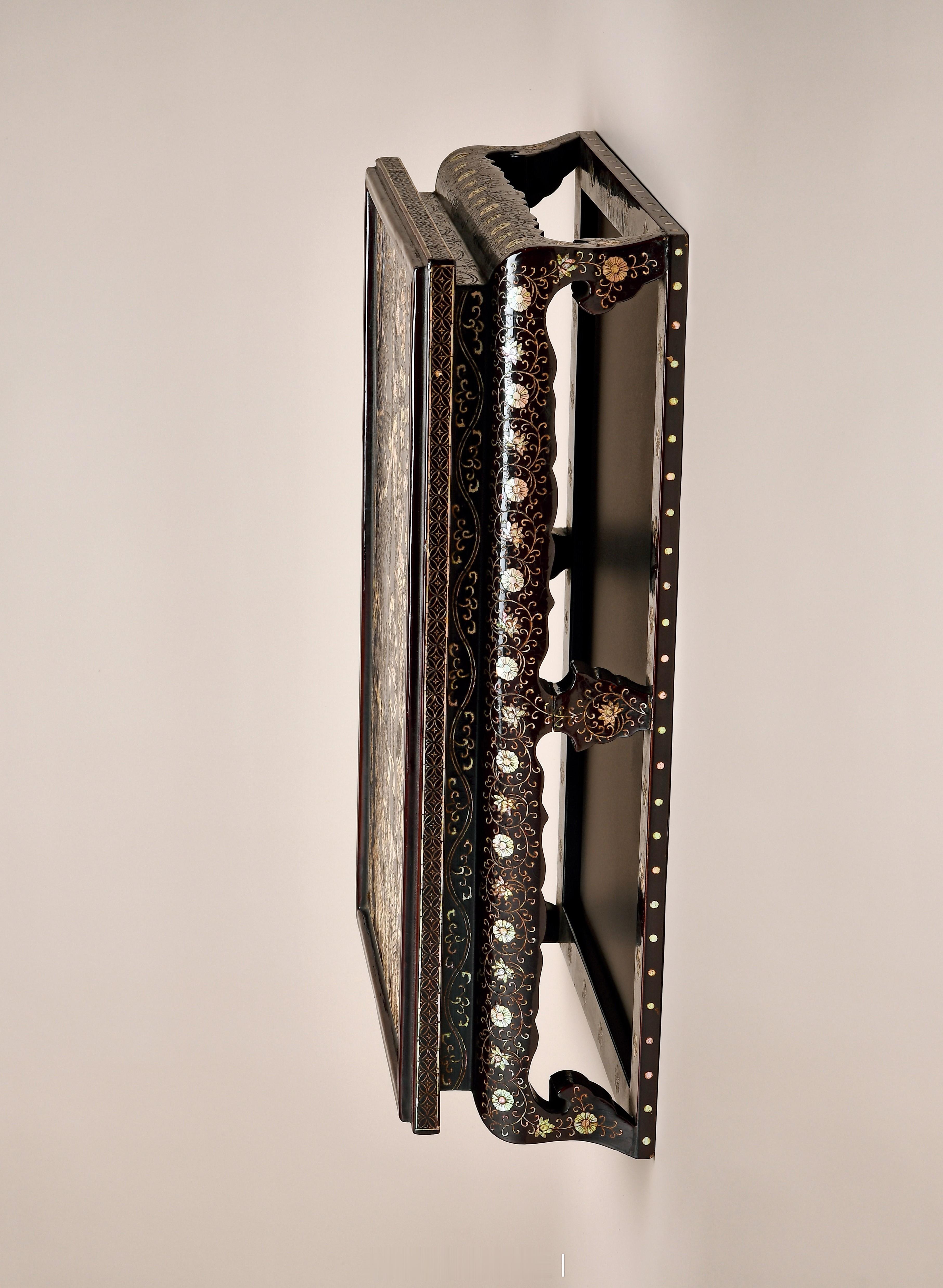 器作几案形,小体低身,通体髹饰黑漆并以夜光螺为材嵌装人物花卉纹。其中,几面呈长方形,四周浅起拦水线,几面满嵌螺钿闹市人物活动图。画面中,有撑起伞盖骑马的富商、有观赏画轴的雅士、有代谢文书的笔吏,有对弈的棋人,还有闲游的路人,十分热闹。画面左侧嵌饰有一座高大宏伟的楼阁,华丽异常。几面冰盘突出,外饰方孔金钱纹一周。束腰,丰肩,肩下四足锼镂花牙,壸门典雅。肩及腿足外壁嵌饰花卉蔓草纹,委婉多姿。四足之间攒装泥托以加固牢靠。泥托外壁嵌饰圆点一周。夜光螺是一种特殊的贝壳加工而成,在不同角度的光线映射下,反映出不同的色彩变化,极为美观。此件小几通体以夜光螺嵌饰,画面内容丰富多样,取材不易,嵌装繁复,加以髹漆打磨,所耗工时甚巨。整器造型古雅美观,螺钿嵌饰彰显出富丽堂皇之韵味,不失为明代螺钿嵌饰家具之精品。