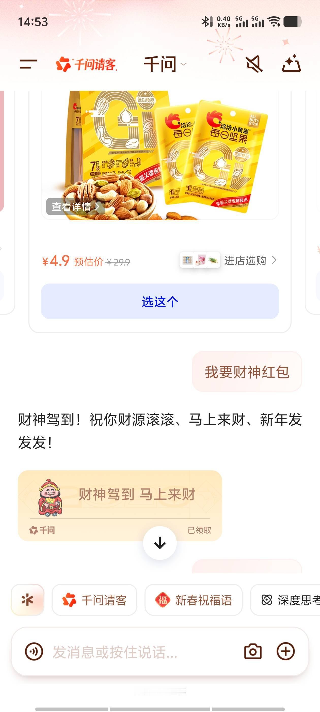 财神爷喊你来千问领发财红包有人登高祈福,有我在线接福!上千问APP,直接输入口令“我要财神红包“即可接财神爷的专属红包!手慢无,错过会错亿的感觉,毕竟是财神给发的红包诶!还有25元超级免单卡,你怎么知道我用它在电影票、酒店上面都省钱了!赶紧拉上家里人一起薅,新年的接好运的新年俗有了