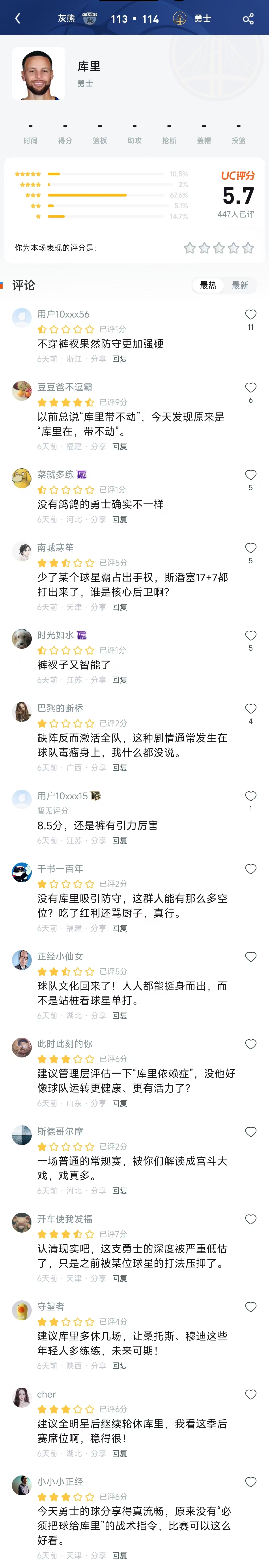 在UC社区的“评分局”中,缺席的库里成为了本场的评分主角,目前已有447人参与打分,评分仅有可怜的5.7分。