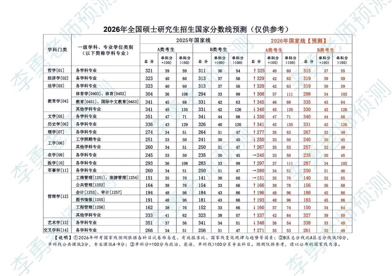 2026研究生初试成绩预测版,整体与去年变化不大,上下4分左右浮动。 哲学上升4分 经济学上升6分,涨幅较大 法学上升6分,涨幅较大 教育学体育类上升4分 教育学教育类上升4分 教育学其他类下降1分 文学下降1分 历史学上升5分,涨幅较大 理学上升3分 工学照顾专业下降1分 工学其他专业上升7分,涨幅较大 农学与去年持平,无变化 医学上升4分 管理学类整体上升2分 艺术学下降3分 交叉学科上升5分,涨幅较大 2月24号以后各学院会相继公布初试成绩查询时间,参考近三年各学院报录比及时做好调剂准备。