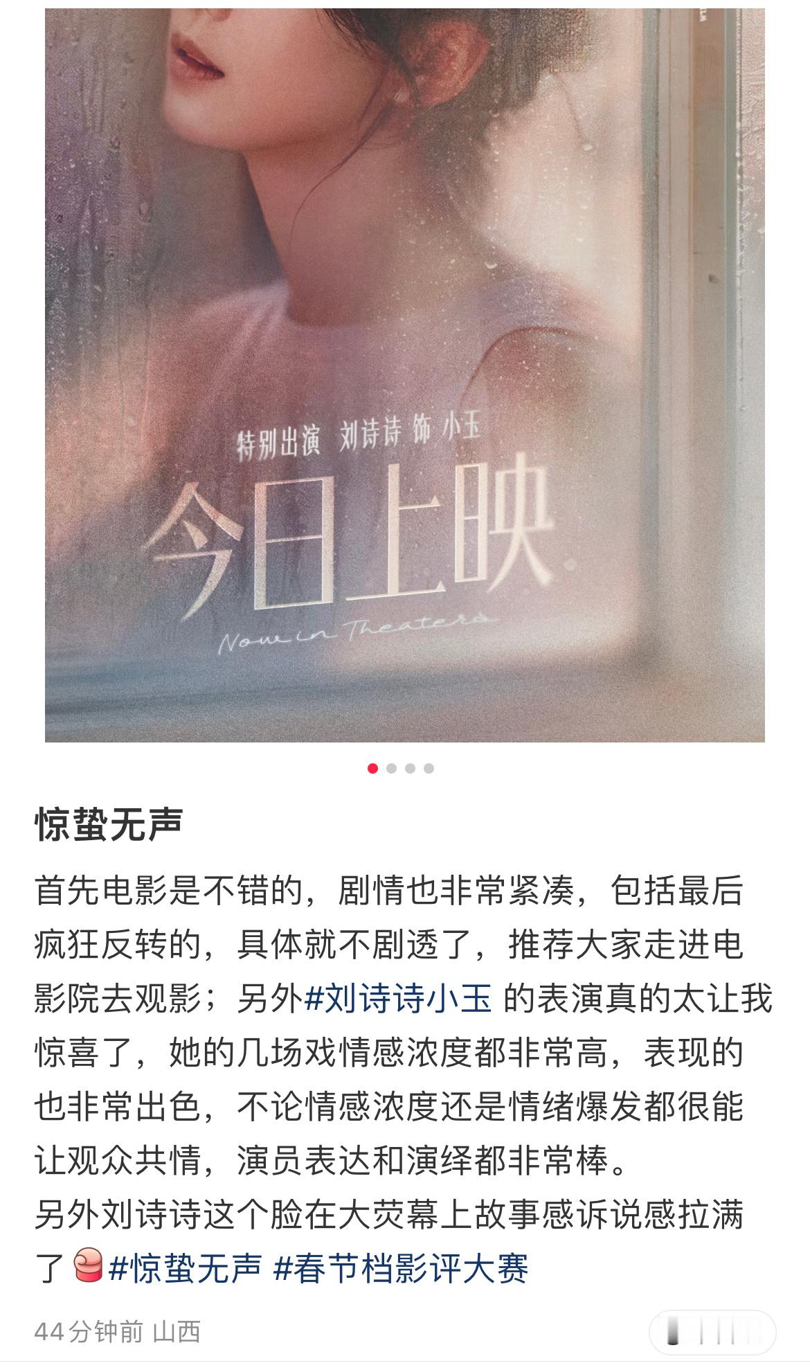 网友《惊蛰无声》观后感,评价刘诗诗演技超好,电影脸,放大的美貌,颠覆记忆, 印象