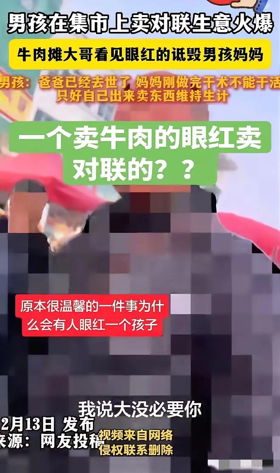 卖牛肉的说一不二,生意做得很大,人也很精明,唯独人品不好。 碰见一个十四岁的孩子在寒风中卖春联,他的心里很不舒服,因为这个孩子的生意很好,人气旺,远比他这个卖牛肉的生意好。 于是他就下意识地去诋毁这个孩子,说他装惨博同情,逼得孩子拿出爸爸的火化证,拿出一堆证件来为自己辩解。 谁见到别人好一点,不是夸奖一句?非得要踩着别人上去,才能觉得自己这块牛皮还好一点?十四岁的孩子替家里扛重担,不容易啊! 还替家里扛着三十万的外债,这个孩子刚刚失去父亲,就遭到这个卖牛肉的如此对待,真是令人气愤。 生意再大,人品如此之差,谁还愿意光顾你这个牛肉摊?你这样的做法能做长久吗? 麻烦各位看官老爷们右上角点击一下“关注”,既方便您进行讨论和分享,又能给您带来不一样的参与感,感谢您的支持!