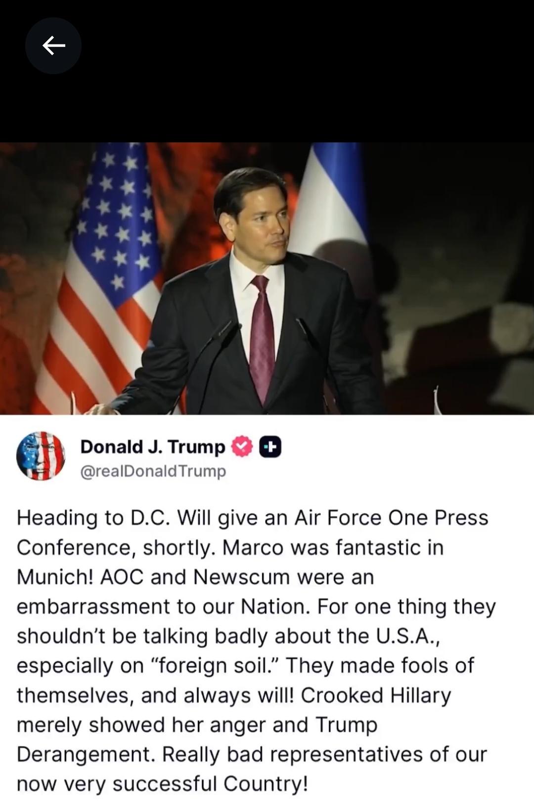 特朗普刚刚对马可·卢比奥在慕尼黑的精彩演讲给予了高度评价,同时猛烈抨击了希拉里、AOC和纽森。 “马可慕尼黑的表现太棒了!” “亚历山大·奥卡西奥-科尔特斯(AOC)和纽纽森简直是我们国家的耻辱,希拉里只会展现她的愤怒和疯狂。他们真是我们这个如今非常成功的国家的糟糕代表!” 亚历山大·奥卡西奥-科尔特斯在慕尼黑安全会议上批评了唐纳德·特朗普的外交政策,警告说他对格陵兰岛的威胁和对基于规则的秩序的攻击正在削弱欧洲盟友对美国的信任。 鲁比奥屈服是因为他别无选择。 由于特朗普的政策及其在国际舞台上的行为,美国的对手比他上任前更加强大。 由于特朗普鲁莽地挑拨离间,试图让世界其他国家与美国为敌,如今他们在经济、外交和地缘政治领域都成为了更强大的竞争对手。 美国疏远了盟友,退出了长期的全球联盟,迫使美国的民主伙伴和曾经友好的中等强国转向东方等国家进行贸易。这很可能促成了他们创纪录的贸易顺差。 特朗普让美国沦为笑柄,而以前的重要盟友现在正在相互合作,建立一个新的世界秩序和国际俱乐部。 在这个俱乐部里,美国是一个敌对的、好战的、麻烦的国家,不值得尊重,绝对不值得任何优待,也不再值得信任,无法从与其他国家协调中受益。 按照特朗普的说法和逻辑。不能在外国领土上诋毁美国,就这么简单。 但是现在真正的问题是:赞扬毫无价值。美国接下来该做什么? 难道是真正有效的边境执法?真正落实到位的削减开支措施?以及停止在海外随意开空头支票的“美国优先”外交政策? 这只有特朗普自己知道,一个魔幻而商人的混合体。 欧洲对特朗普 欧盟反击特朗普 特朗普外交突袭