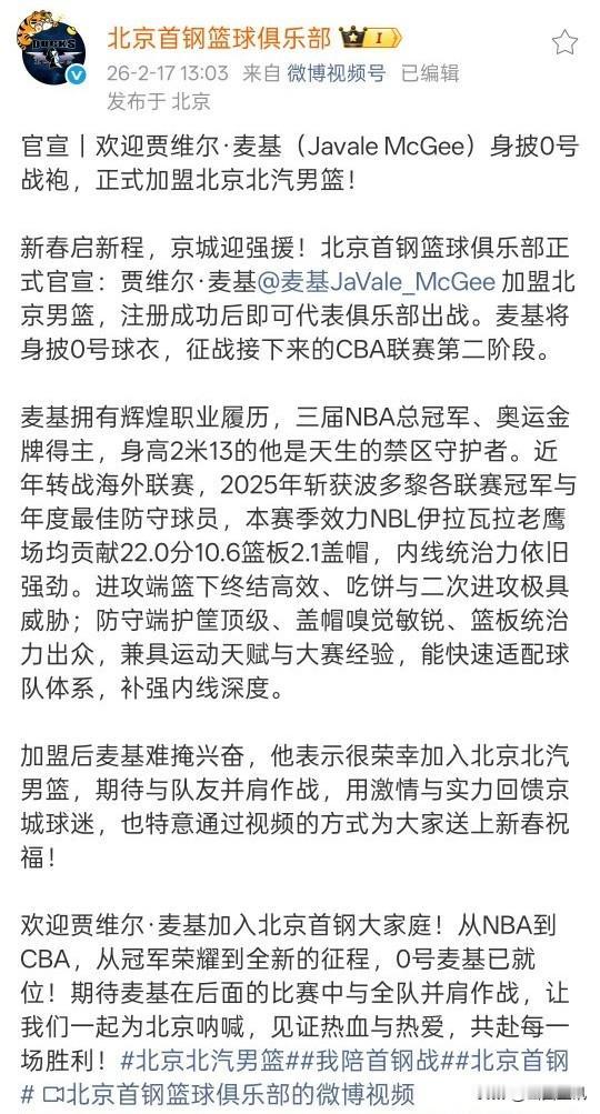 北京首钢男篮向广东男篮和广厦是男篮发出提示:本赛季总冠军不是你! 大年初一北京男篮官宣:三届NBA总冠军、奥运金牌得主,身高2米13的贾维尔·麦基加盟!上赛季,北京男篮淘汰山西汾酒男篮后,在与广厦男篮冠军争夺战中早早失去了悬念。如果不是考虑球场门票等因素,北京男篮与广厦男篮不会打到最后一场生死战决出胜负。为了夺冠,本赛季在上赛季引进周琦、陈盈骏的基础上,又引进了赵睿,但是这些名气大、不卖力的球星们一个个沽名钓誉,坐等其他球员得分取胜。尤其是内线周琦和范子铭依然不足以撑起夺冠内线。在此情形下,北京男篮引进他禁区的王牌守护者,能否成为北京夺冠的最后拼图?上海男篮的白边会不会是他的对手?广厦男篮的卡尔顿能否制约麦基?广东男篮内线根本无法与之匹配,北京男篮真的成了夺冠之队了吗?