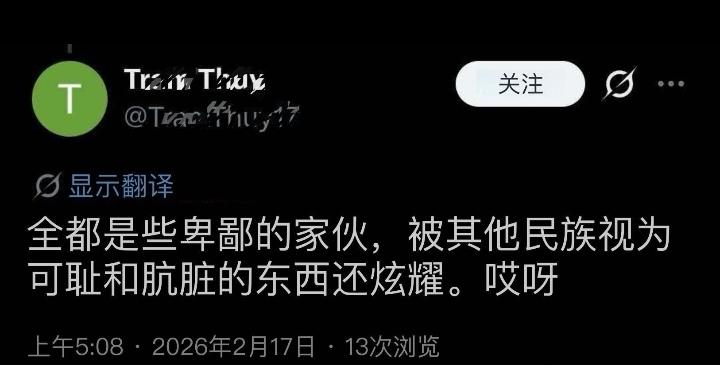 汉服迎春节的帖子下,来自不同国家的网友大部分都表达了“真的很好看!”“谢谢介绍中国传统服饰!”的积极留言。 当然,偶尔也会出现某些韩国、越南网民酸溜溜的言论就如下面这段越南语: Toàn lũ điên khùng hèn hạ, bị các dân tộc khác coi như chó và dơ bẩn mà còn khoe. Ói 中国人穿汉服碍你什么事,妨碍你在TikTok上偷中国文化了是吗? 偏偏就有个别越南网友跳出来满嘴恶语,实在让人恶心,这种又酸又坏的心态,暴露的恰恰是内心的自卑与狭隘。围绕东大这几个偷文化的国家中,韩国人有点傲慢,至少韩国是发达国家,越南人真的很搞笑,才吃饱饭就想装大款了,就像从东家拿了钱在贫民窟买了宅子,就以为自己也是高门大户了,不知道哪儿来的脸偷中国的文化,伪装自己不是野鸡。 奉劝这些人先管好自己,别再靠偷文化、泼脏水找存在感,丑陋的言论只会显得你们更加可悲可笑。 注:本文信息源于网络,内容仅为个人观点,无不良导向。