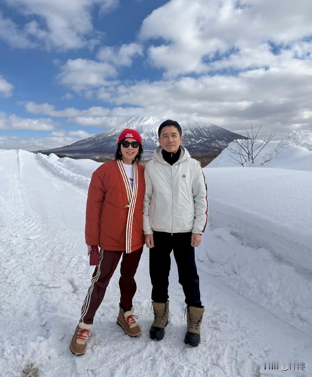 刘嘉玲与梁朝伟马年春节在日本度假,夫妻俩以富士山为背景甜蜜合影。60岁的刘嘉玲一