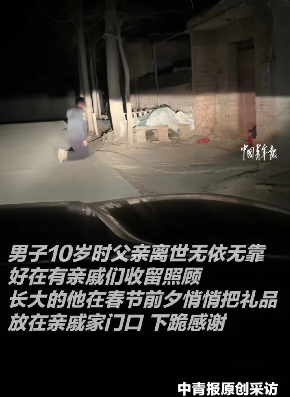 破防了!山东聊城,一个30岁男子,凌晨3点辗转在几个亲戚家门口,“扑通”跪地,磕头,然后转身就走,背后原因让人泪目 他今年30岁,这份恩情,他整整记了20年。 10岁那年,天塌了。父亲突然离世,家里的顶梁柱断了。没过多久,母亲也一走了之,再也没有回来。一夜之间,曾经有爸有妈的家,空了。 别的孩子放学有人接,饿了有饭吃,受委屈有怀抱。他回到家,只有冷锅冷灶,和满屋子的寂静。 饿了没人管,冷了没人问,夜里怕黑,只能缩在墙角偷偷哭。 小小年纪,就尝尽了无依无靠的滋味。 是两三家至亲,实在看不下去,轮流伸手拉了他一把。这家管吃,那家管住,这家添衣,那家叮嘱。 没有豪言壮语,没有惊天承诺, 只是一句句“来我家”“先住下”“有我一口就有你一口”, 把他从绝望的边缘,硬生生拉了回来。 那些年,每家日子都不宽裕,却都把他当成自家孩子疼。 冬天怕他冻着,给他缝棉衣; 夏天怕他热着,留着凉白开; 放学回家,不管走进哪一家,都有一碗热饭等着他。他心里比谁都清楚:没有这两三家亲人,就没有今天的他。 从那时起,一颗报恩的种子,就深深埋在心里。他发誓:等我长大了,一定好好报答,一定不让你们白疼我。 可一晃,他30岁了。 没成家,没立业,创业失败,还欠着外债。日子过得一地鸡毛,一身疲惫。 在别人眼里,这只是人生低谷。 可在他心里,却是抬不起头的愧疚。 他觉得自己没出息,没混出个人样,没脸堂堂正正走进任何一家曾经收留他的门。 他怕亲戚们担心,怕给各家添负担,怕自己一身狼狈,辜负了当年一碗饭、一份暖、一份拉扯大的情分。 他更怕,让曾经疼他、帮他的亲人失望。 思来想去,他做出了一个让人心疼到窒息的决定: 悄悄报恩,绝不打扰任何一家。 春节前那一天,他揣着省吃俭用攒下的钱,买好几份过年礼品,认认真真写了短信。 他一家一家走过去,每到一户门口,都停下脚步。 听着门里熟悉的动静,他鼻子一酸,眼泪在眼眶里打转。 那是他最想亲近、最想感恩的亲人,可他却不敢敲门。 他轻轻把礼品、钱和信放在门口,动作轻得怕惊动里面的人。 然后,他挺直身子,整理了一下衣角。双膝一弯,直直跪下,额头重重触地,恭恭敬敬磕了一个头。 这一跪, 跪的是儿时绝境里的一饭之恩; 跪的是风雨飘摇中的收留之情; 跪的是两三家亲人,十几年如一日的拉扯与照顾; 跪的是自己没混出样子、无以为报的满心愧疚。 他死死咬着牙,没让自己哭出声。 磕完头,他慢慢起身,抬手抹了抹眼角。最后深深看一眼这扇给过他温暖、给过他家的门。 没有敲门,没有呼喊,没有回头。 他转过身,一步一步,沉默地赶往下一家,再重复一遍同样的举动。 每一家,都是放下、磕头、默默离开。 信上很短,字不多,却字字戳心: “儿时的一饭之恩,我永远记在心里。我走了,不留家里吃饭了,不给你们添麻烦。祝你们新年平安,一切都好。” 穷不丢良心,难不忘恩情。 这一跪,跪的是教养,是良心,也是一个成年人最让人心疼的体面。 这个事情大家怎么看呢? 山东聊城30岁男子跪别亲人成年人最让人心疼的体面穷不丢良心难不忘恩情 一饭之恩终身难忘 春节最破防的瞬间 来源:中国青年报及网络公开内容,如有侵权请联系即删 配图说明:本文配图/视频素材来自@ 中国青年报,仅用于内容分享,侵权联删