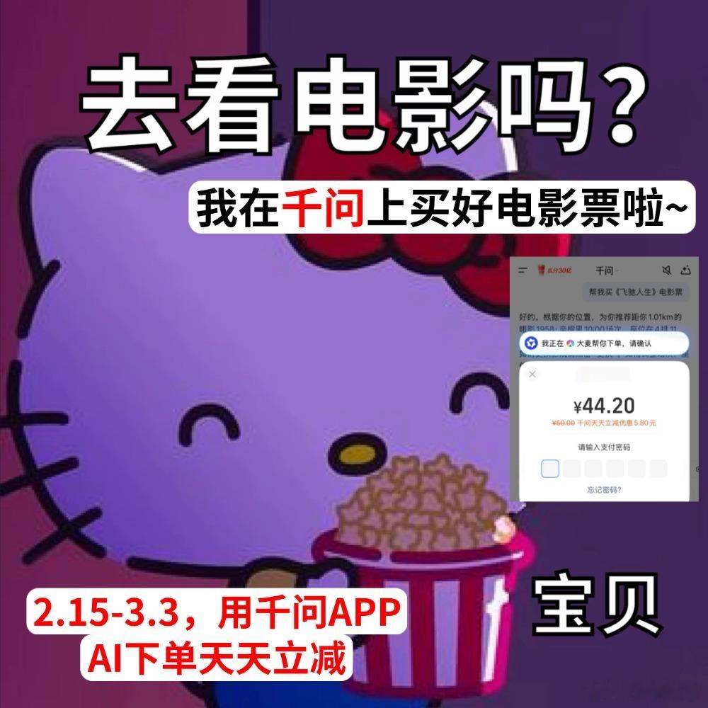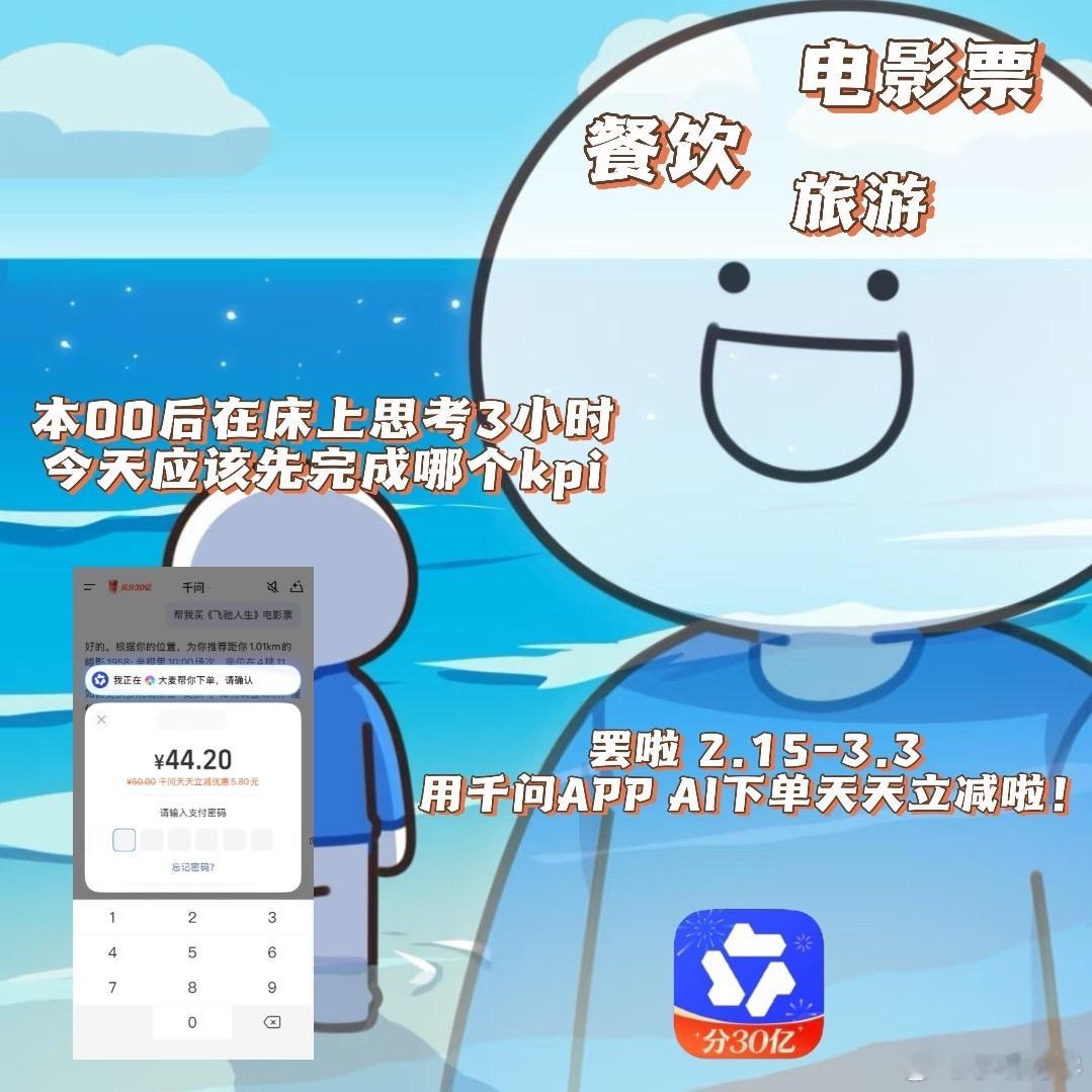 千问没有免单卡也能天天减免 今年春节AI圈真的玩明白了!千问现在不只是答题助手,直接变成生活省钱搭子。不用凑卡、不用复杂操作,一句话下单,电影票、机酒、外卖、百货都能首单必减,覆盖太全了春节回了趟老家,从线上到路边小店都在用,正好订了个酒店用上了千问这波优惠AI生活化真的很落地,省钱不靠套路,靠AI效率,这波很实在。划重点截至3月3日,每天都能减,随手用都香!