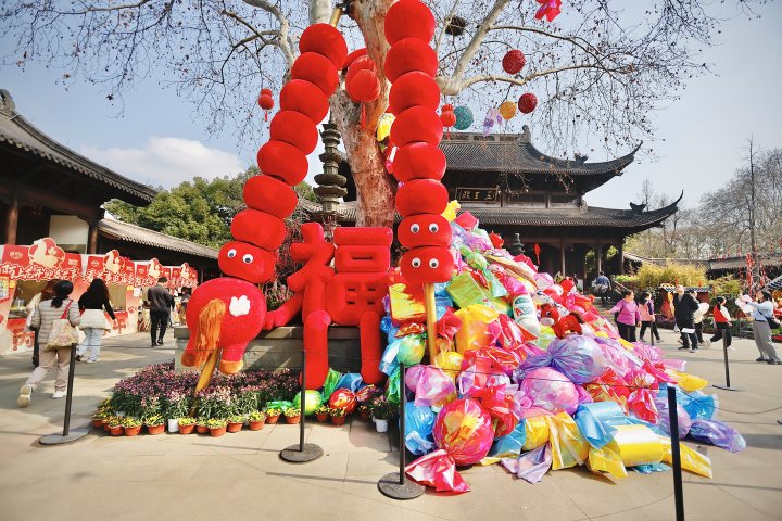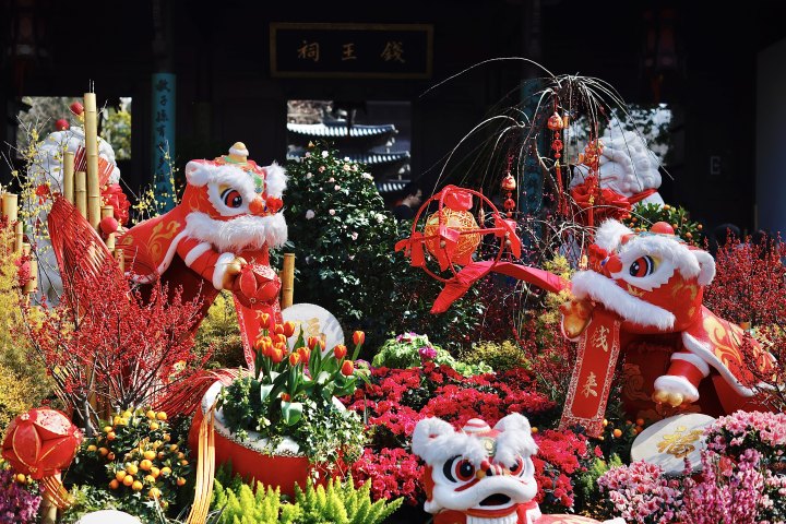 钱王祠门口的花境是《太平年》,憨态可掬的吉狮在花丛间献瑞,寓意家国安康;钱王祠里面,还有《跃马花间》《糖福禄》《富足年》等主题花境,一派昂扬春意。