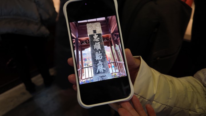 这是张建涛第一次踏足钱王祠,不到1小时已拍了30多张照片,她最满意的一张照片是碑亭里的一座石碑,上刻碑文“忠顺贻庥”。此四字为乾隆皇帝题写,意指“忠诚和顺,泽及后人”。