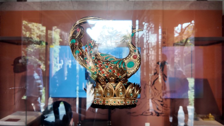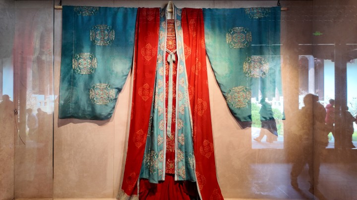 在钱王祠,她看到了剧中孙太真大婚的婚服、头冠,被册封王妃穿的礼服,还有钱弘俶的常服、回门袍等实物。看着衣服上细腻的金线绣、头冠上振翅欲飞的金凤,她感慨了一声:“还原得太精妙了。”