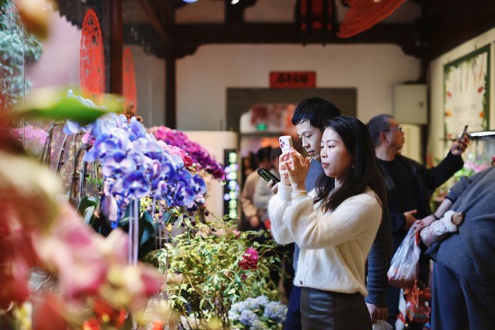 “走了一上午累了,在这里歇会儿。”谢先生和其妻子是杭州本地退休夫妇,他们一大早在南山路徒步,逛完柳浪闻莺,进钱王祠“充个电”。“我们来过很多次,每年花展不落下,最近正好又有展览,就来看看历史,吃吃东西。”