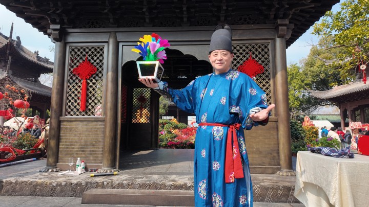 穿一身宋服的毛为民很受小观众喜爱,因为他一会儿变出花,一会儿摸出糖。每场表演时间约1小时,当天上午由于观众过于热情,毛为民特意加演了一场,他说:“我父亲是杭州杂技团的口技师傅,会学鸟叫,我8岁跟他学口技,后来喜欢上了变魔术,现在我表演的戏法还专门学习了宋朝的杂技雅趣。”