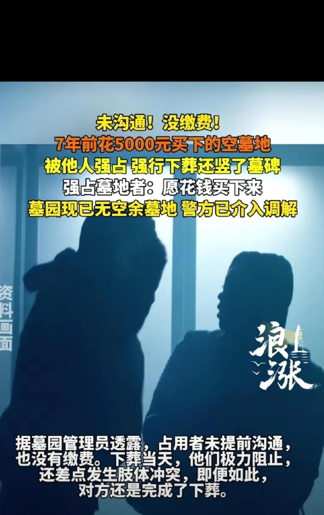 这是明抢啊!江苏扬州,80岁老人7年前精心挑选了一块墓地,儿女们为了让老人宽心,花5000元买了下来。谁知,不久前家人竟发现,原本空着的墓地竟被人占用,还光明正大竖起了墓碑。一家人震惊不已,找到墓园管理方讨要说法,工作人员称:确实被当地村民强行占用了,他们拦都拦不住。对此,占用者嚣张表示:我愿意花钱买下来!这让老人万万无法接受。 80多岁的老两口,7年前跑遍整个墓园,精挑细选了一块靠竹林、采光好的墓地,就想百年后有个安稳归宿。子女孝顺,当场掏5000块买下,本是让老人安心的晚年念想,没想到竟成了闹心的根源! 前段时间家人一去墓园直接傻眼:自家合法买了7年的空墓地,居然被人偷偷下葬,还立了墓碑! 找墓园理论,工作人员一脸无奈:是当地村民硬占的,来人多还动手,我们根本拦不住! 更气人的是,霸占墓地的村民毫无愧疚,轻飘飘甩下一句:我愿意花钱买下来! 花钱买?这是先抢了别人的东西,再假装花钱买?跟明抢有什么区别! 这事一曝光,网友直接炸锅了: ✅“这也太嚣张了!法治社会还搞强占?谁给的胆子?” ✅“墓园收了钱就该管,拦不住就是失职,必须追责!” ✅“老人就图个安心归宿,这是戳心窝子啊,太缺德了!” ✅“别调解!直接依法办事,强行迁坟,还老人公道!” 我真的越看越气!这不是一块墓地的事,是公然践踏他人合法权益,连八旬老人的最后念想都要抢,良心何在? 明明是花钱买的合法墓地,使用权受法律保护,村民强行下葬就是妥妥的侵权!墓园收了费却不履行看管义务,事发不通知,纯属违约失职! 现在派出所介入调解,但家属和网友都不买账:违法侵权就该依法处理,不是一句“我买”就能糊弄过去的! 老人现在天天唉声叹气,晚年安宁全被搅乱,实在让人心疼。 法治社会,从不是谁横谁有理!希望相关部门硬气一点,依法还老人一个公道,别让普通人的合法权益,被肆意践踏!