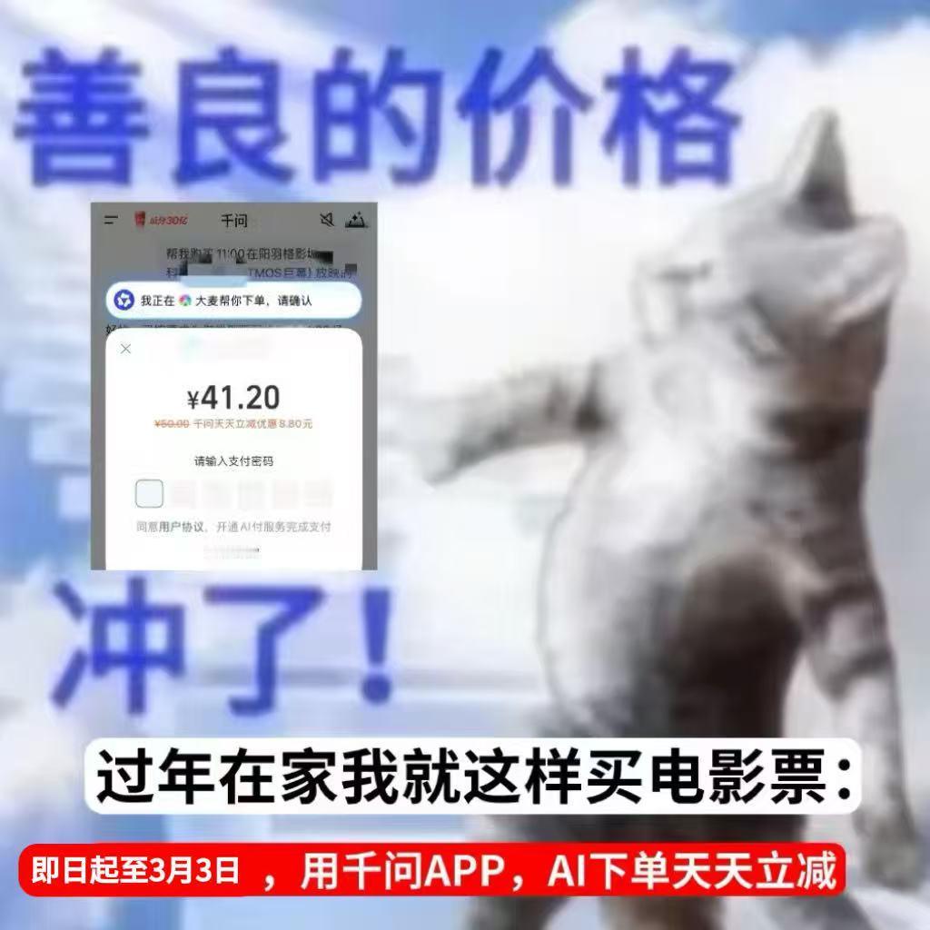 千问没有免单卡也能天天减免 春节消费全靠千问省!首单必减,不用免单卡也能天天有优惠,电影、外卖、出行都能用。AI一键下单自动减钱,简单又实在,日常省钱真的超方便!