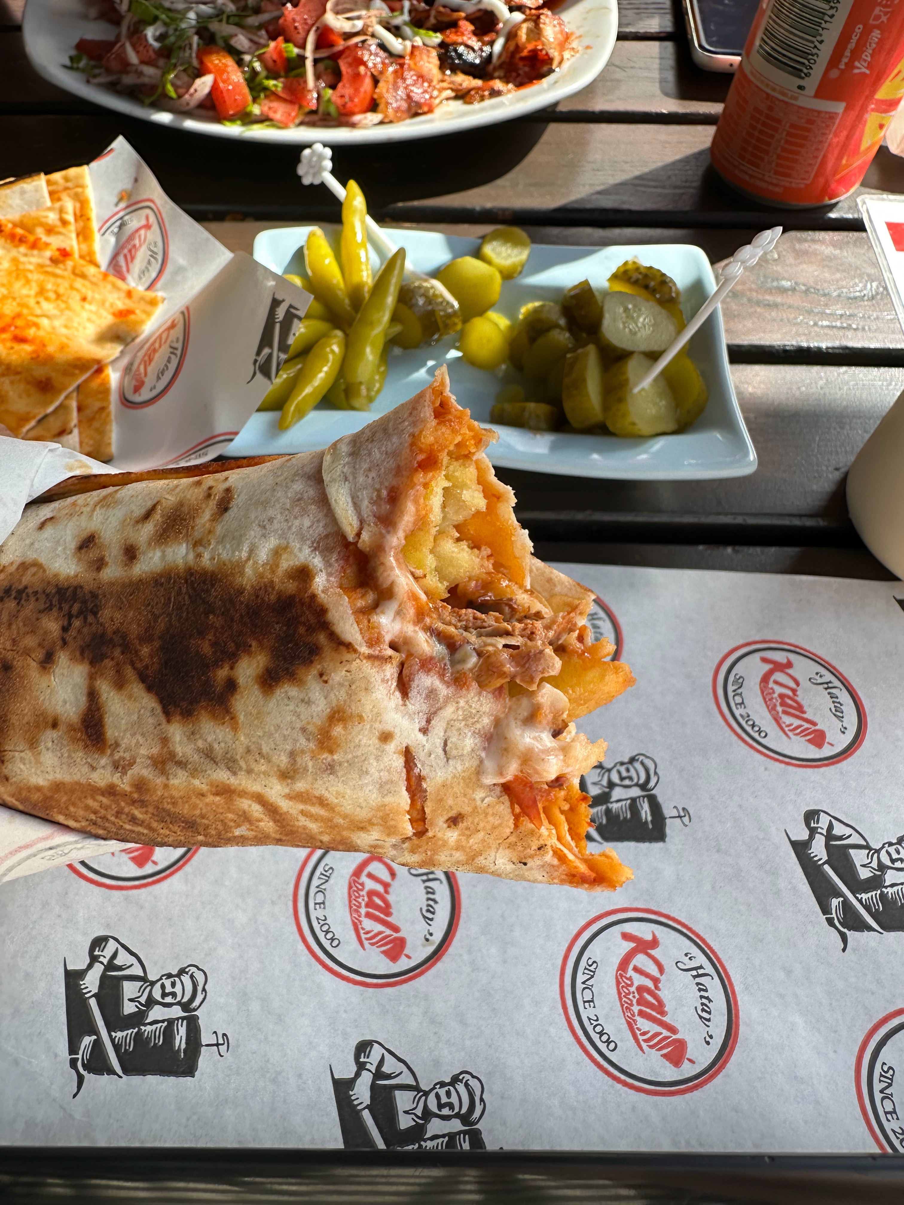 图一这个卷饼是我到土耳其以来最好吃的饭,面香很浓,里面卷着土豆条和烤肉,土豆口感很绵密,烤肉汁水很丰富,吃起来不会太干,饼里也没有沙拉酱、蕃茄酱这种异端,就是原原本本的香。