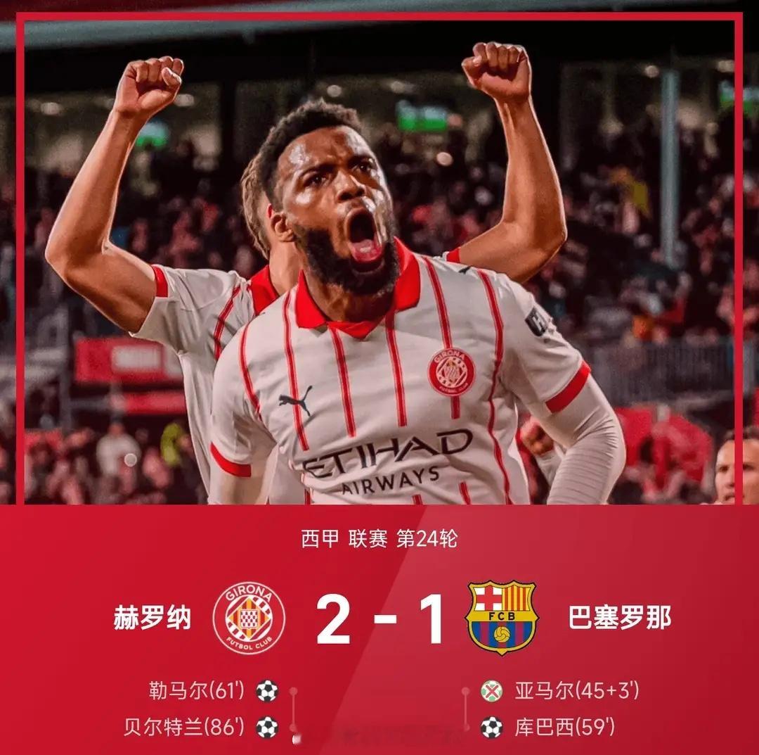 2月17日 25/26赛季西甲联赛第24轮,赫罗纳2-1战胜巴塞罗那,贝尔特兰第86分钟上演绝杀。全场比赛,上半场拉菲尼亚中柱,奥尔莫造点,亚马尔失点+失单刀;孔德第59分钟助攻库巴西头球破门,2分钟后勒马尔包抄空门扳平;埃切维里踩踏孔德脚踝未被吹犯规,贝尔特兰抽射破门完成绝杀,补时阶段费尔明的绝平进球因莱万越位被吹无效。巴萨遭遇各项赛事两连败,西甲榜首易主。开场6分钟,拉菲尼亚底线倒三角,亚马尔兜射过于追求角度偏出远门柱,第12分钟,希尔反击送传中,拉菲尼亚回防到己方禁区完成关键拦截,第19分钟,错失良机!亚马尔反击单刀直面门将选择挑射攻门被扑,第21分钟,亚马尔反击带球突破被吹犯规,场边弗里克摊手表示无奈,第23分钟,齐甘科夫外脚背直塞,瓦纳特抽射被霍安·加西亚倒地没收,第29分钟瓦纳特前插小角度单刀抽射攻门,霍安·加西亚再献关键扑救,第33分钟亚马尔外脚背撩传,孔德禁区内抢点被加扎尼加拳击球解围,第43分钟,差之毫厘!拉菲尼亚禁区内低射攻门,皮球击中立柱弹出,上半场双方0-0闷平。巴萨在上半场完成了9次射门,控球率67,赫罗纳在上半场3次射门,控球率仅有33,巴萨还是有绝对优势!下半场比赛,第59分钟,巴萨前场连续的攻势,右肋位置孔德观察后送出精妙传中,门前库巴西抢点头槌破门打进个人赛季首球!巴萨1-0领先,第61分钟,赫罗纳左路进攻连续的短传渗透,瓦纳特禁区左侧下底传中被解围不远自己得球再扫门前,瓦纳特无人盯防轻松包抄入网!赫罗纳1-1扳平,第67分钟,亚马尔传中,雷斯头球解围险些自摆乌龙,加扎尼加贡献神扑,第72分钟,神了!赫罗纳禁区内连续攻门,霍安·加西亚完成三连扑,第75分钟,禁止入内?罗卡小角度单刀抽射,霍安·加西亚再度贡献神扑,第86分钟,双方中路争抢球权,埃切维里得球推进到弧顶,与孔德对抗后者倒地不起,赫罗纳继续进攻做球,贝尔特兰得球调整一步打门得分!最终主裁认定进球有效!赫罗纳2-1巴萨,全场比赛结束,赫罗纳2-1绝杀巴萨!