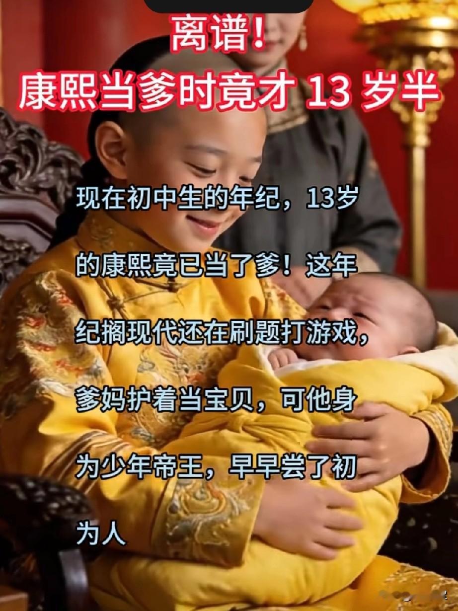 古人寿命短, 女人十五就成年了。 皇家要继承皇权的! 康熙首次成为父亲是在13 周岁 6 个月(虚岁 14)。他的第一个孩子是长子承瑞,由庶妃马佳氏(后为荣妃)于康熙六年九月二十日(1667 年 11 月 5 日)所生,康熙生于 1654 年 5 月 4 日,以此计算,他当时实岁 13 岁 6 个月零 1 天。承瑞在康熙九年夭折,年仅 3 岁。