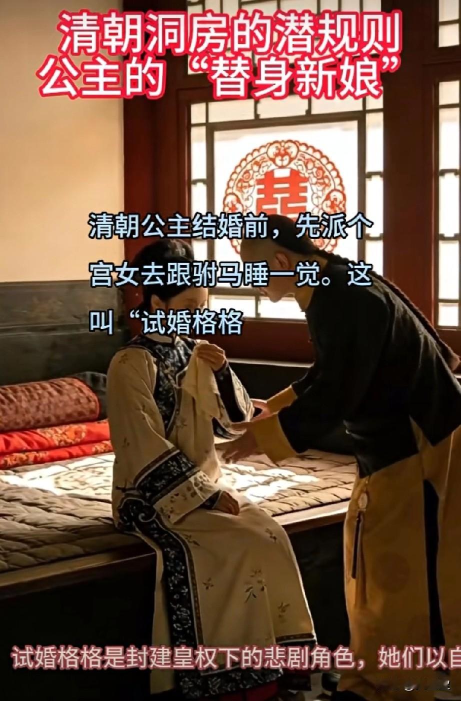 宫女如果怀孕咋办? 清朝公主的“替身新娘”, 她们是替公主婚前探查驸马的宫女。 清朝公主结婚前,先派个宫女去跟驸马睡一觉,这叫“试婚格格”专门去验驸马身体行不行,脾气好不好,第二天还要去跟宫里么么汇报细节?