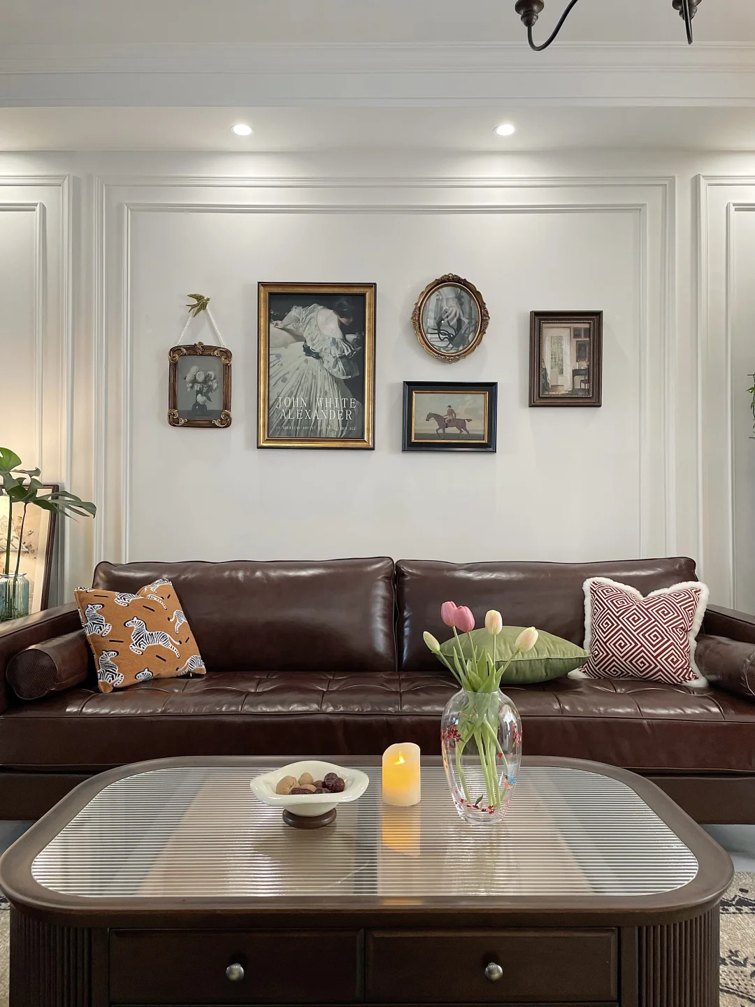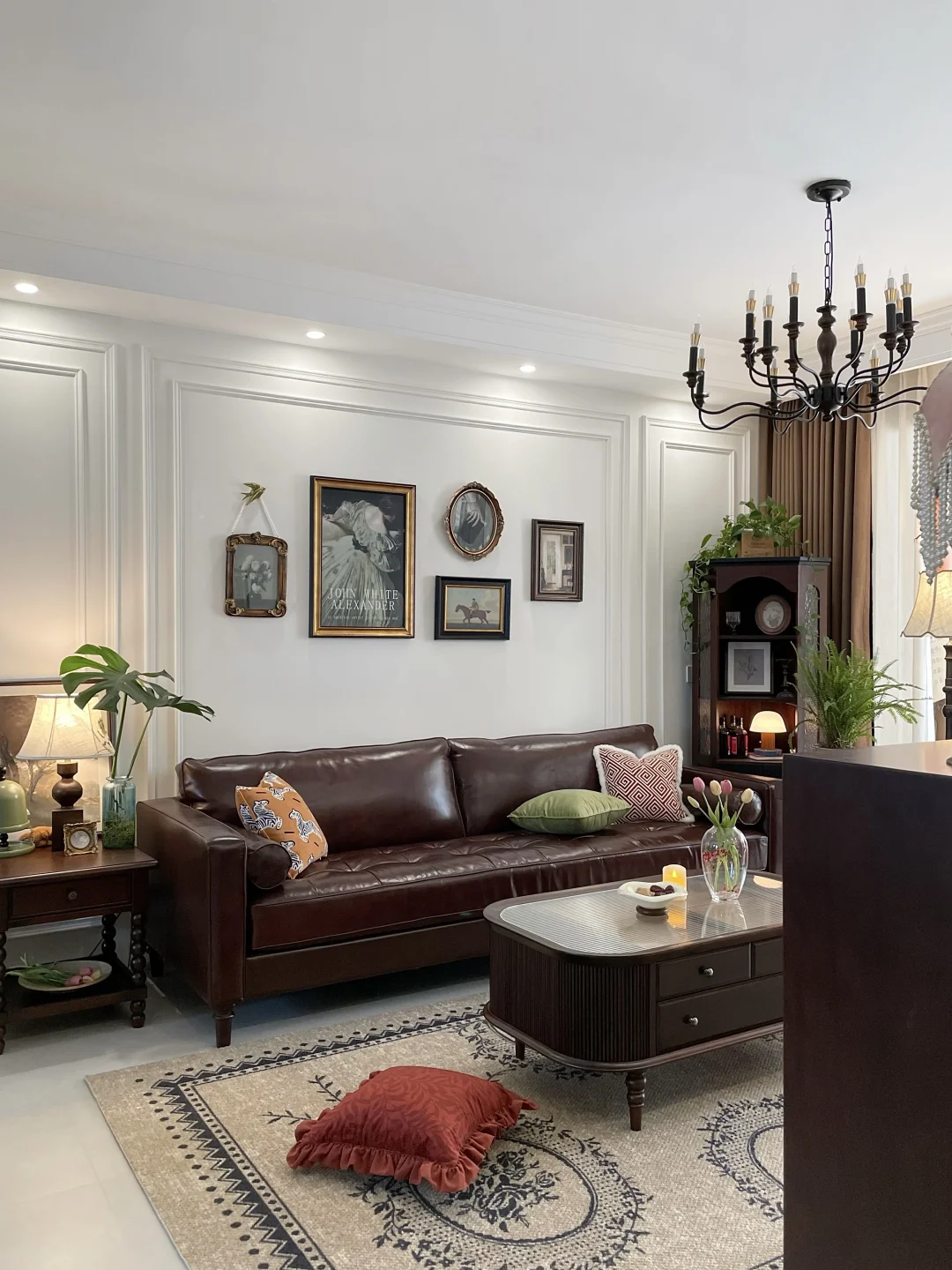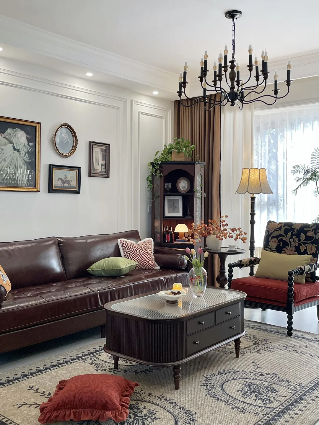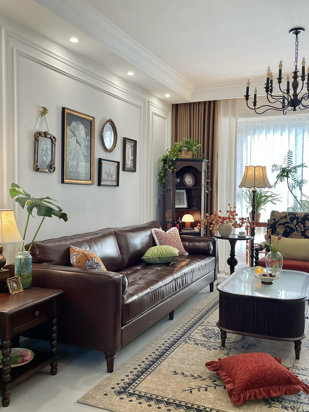 建筑面积120平,套内95平 装修时没找装修公司没请设计师,全程自己盯 没有复杂硬装,墙面通刷乳胶漆 双眼皮吊顶+石膏线背景墙 简简单单,也装出了梦想中的美式复古小家 全屋家具闭眼入了一具一家 风格统一不踩雷,氛围感直接拉满 普通人不会搭配也不怕,放心跟着抄作业~ 🛋️ 沙发墙·客厅C位 深棕色真皮沙发+经典美式拉扣设计 复古韵味十足,经典又稳重 实木框架搭配高密度海绵坐垫扎实又舒服 搭配莫奈·花瓣实木转角柜 玻璃门展示+收纳双在线,颜值实用两不误 📺 电视墙·复古氛围感拉满 两米长莫奈·花瓣电视柜+同系列实木边柜 再配上花好月圆留声机 就是我喜欢的美式复古电影画面感 ☕ 凡尔赛·风琴茶几 精致琴键设计搭配玻璃桌面 复古不沉闷,时尚耐看超适合年轻人 六个抽屉把桌面杂物通通藏起来,整洁又好看 🪑 角落休闲区 黑色繁花珍珠椅,造型精致优雅 搭配小巧实木小圆几 脚下地毯选的温莎古堡系列,配色经典沉稳 随手一拍都是画报即视感,宅家幸福感满满 不用复杂装修,不用花大价钱 普通人家,也能拥有理想中的美式复古小家❤️