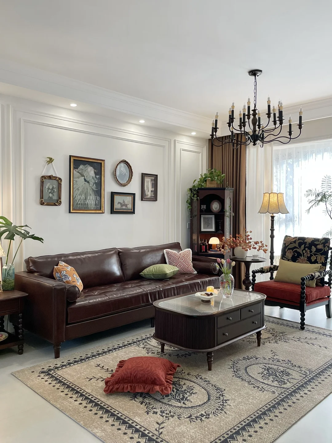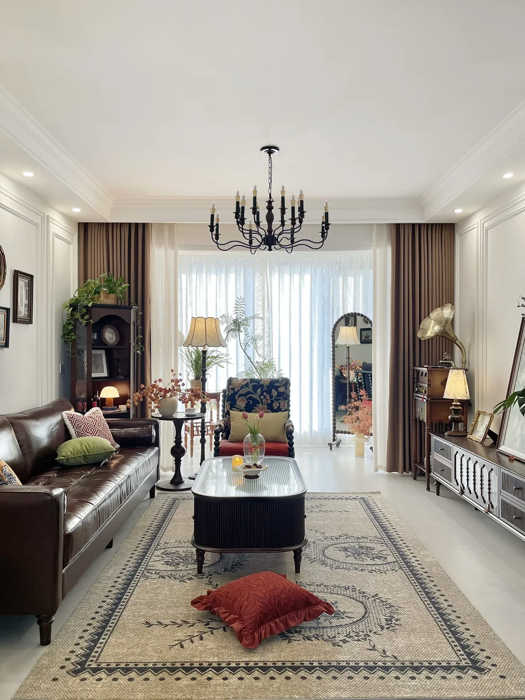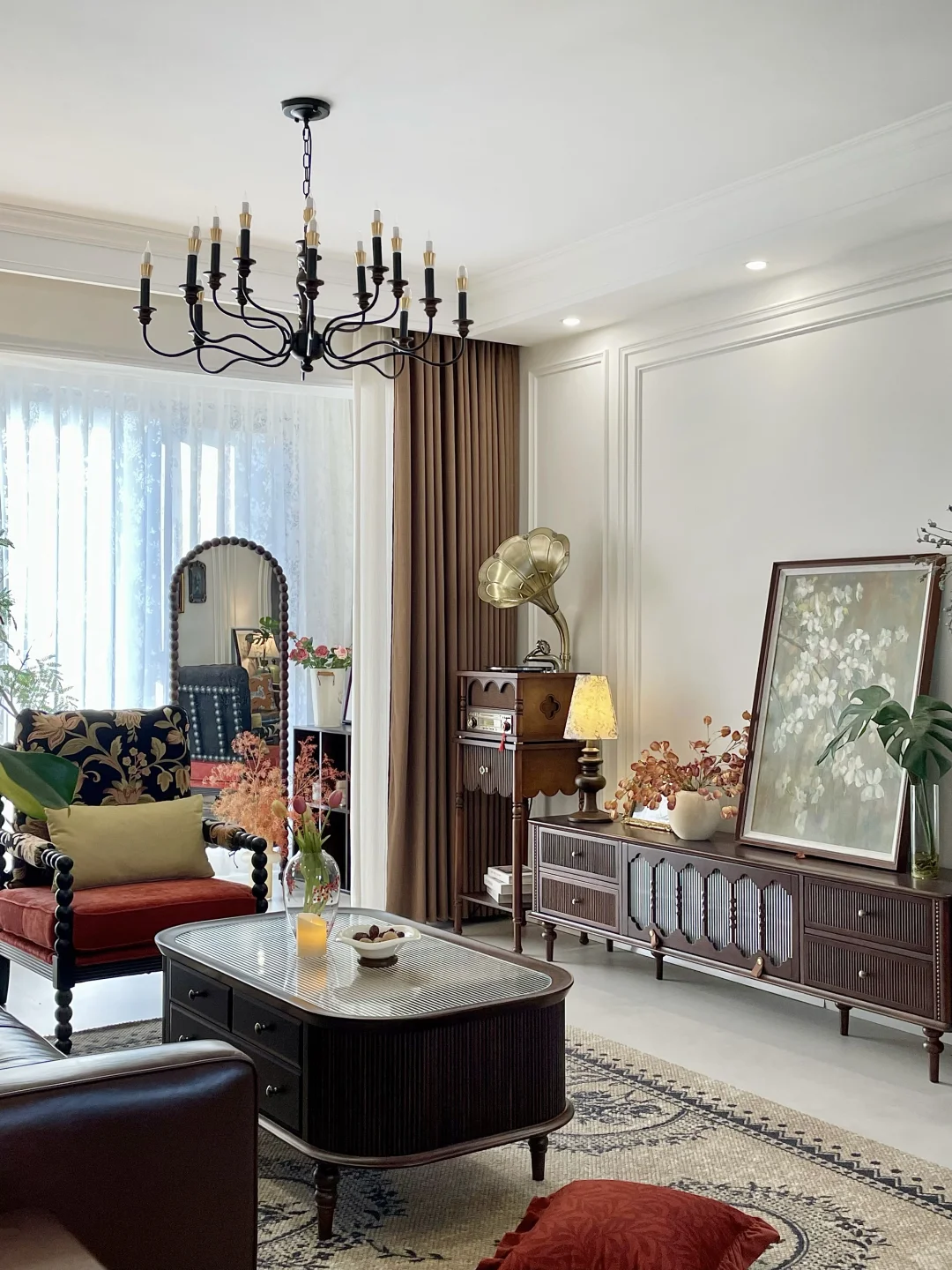 建筑面积120平,套内95平 装修时没找装修公司没请设计师,全程自己盯 没有复杂硬装,墙面通刷乳胶漆 双眼皮吊顶+石膏线背景墙 简简单单,也装出了梦想中的美式复古小家 全屋家具闭眼入了一具一家 风格统一不踩雷,氛围感直接拉满 普通人不会搭配也不怕,放心跟着抄作业~ 🛋️ 沙发墙·客厅C位 深棕色真皮沙发+经典美式拉扣设计 复古韵味十足,经典又稳重 实木框架搭配高密度海绵坐垫扎实又舒服 搭配莫奈·花瓣实木转角柜 玻璃门展示+收纳双在线,颜值实用两不误 📺 电视墙·复古氛围感拉满 两米长莫奈·花瓣电视柜+同系列实木边柜 再配上花好月圆留声机 就是我喜欢的美式复古电影画面感 ☕ 凡尔赛·风琴茶几 精致琴键设计搭配玻璃桌面 复古不沉闷,时尚耐看超适合年轻人 六个抽屉把桌面杂物通通藏起来,整洁又好看 🪑 角落休闲区 黑色繁花珍珠椅,造型精致优雅 搭配小巧实木小圆几 脚下地毯选的温莎古堡系列,配色经典沉稳 随手一拍都是画报即视感,宅家幸福感满满 不用复杂装修,不用花大价钱 普通人家,也能拥有理想中的美式复古小家❤️