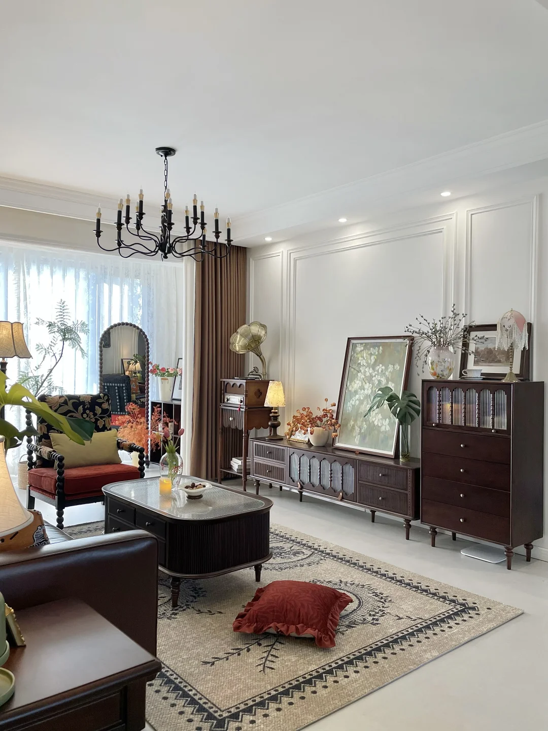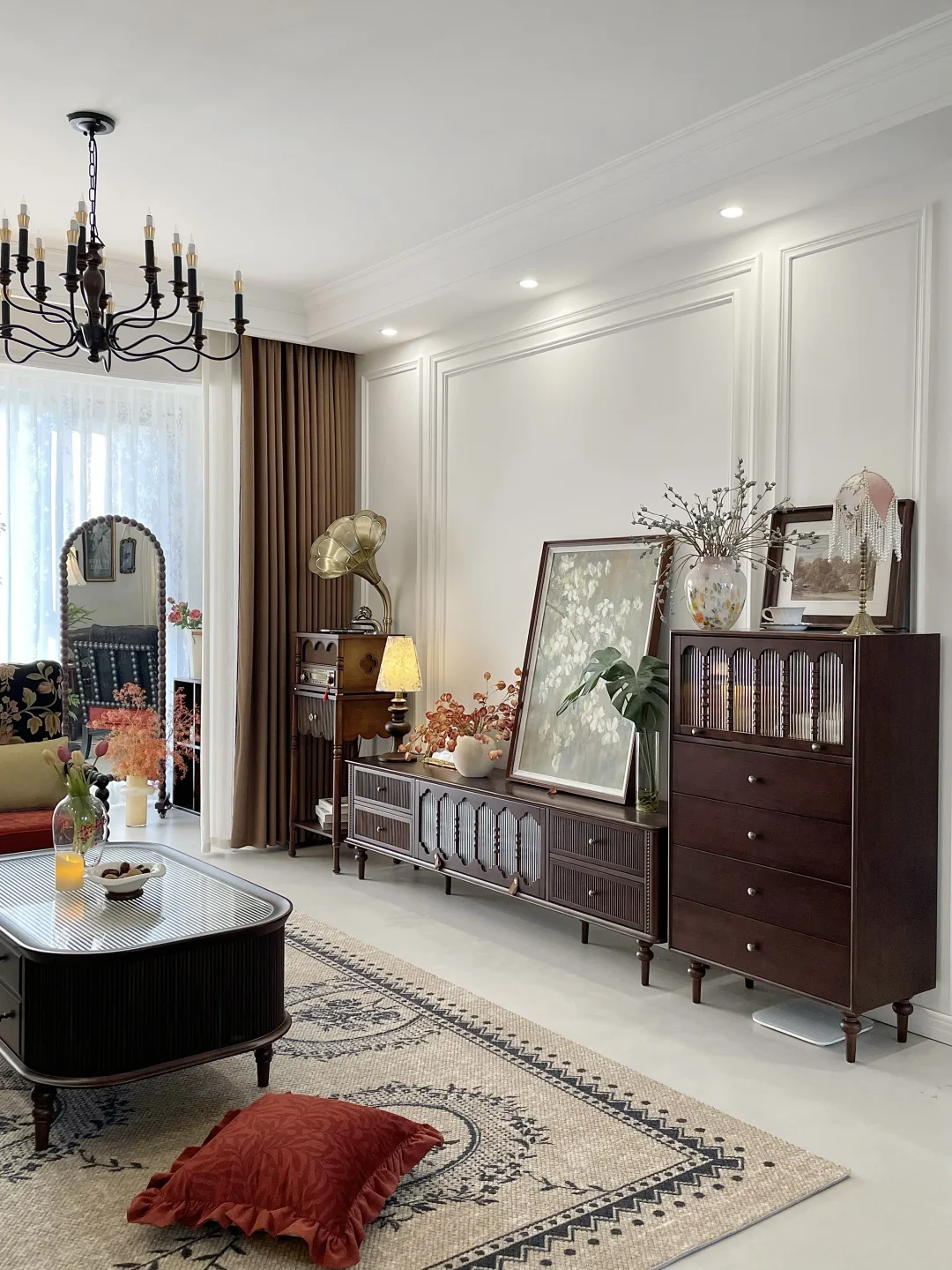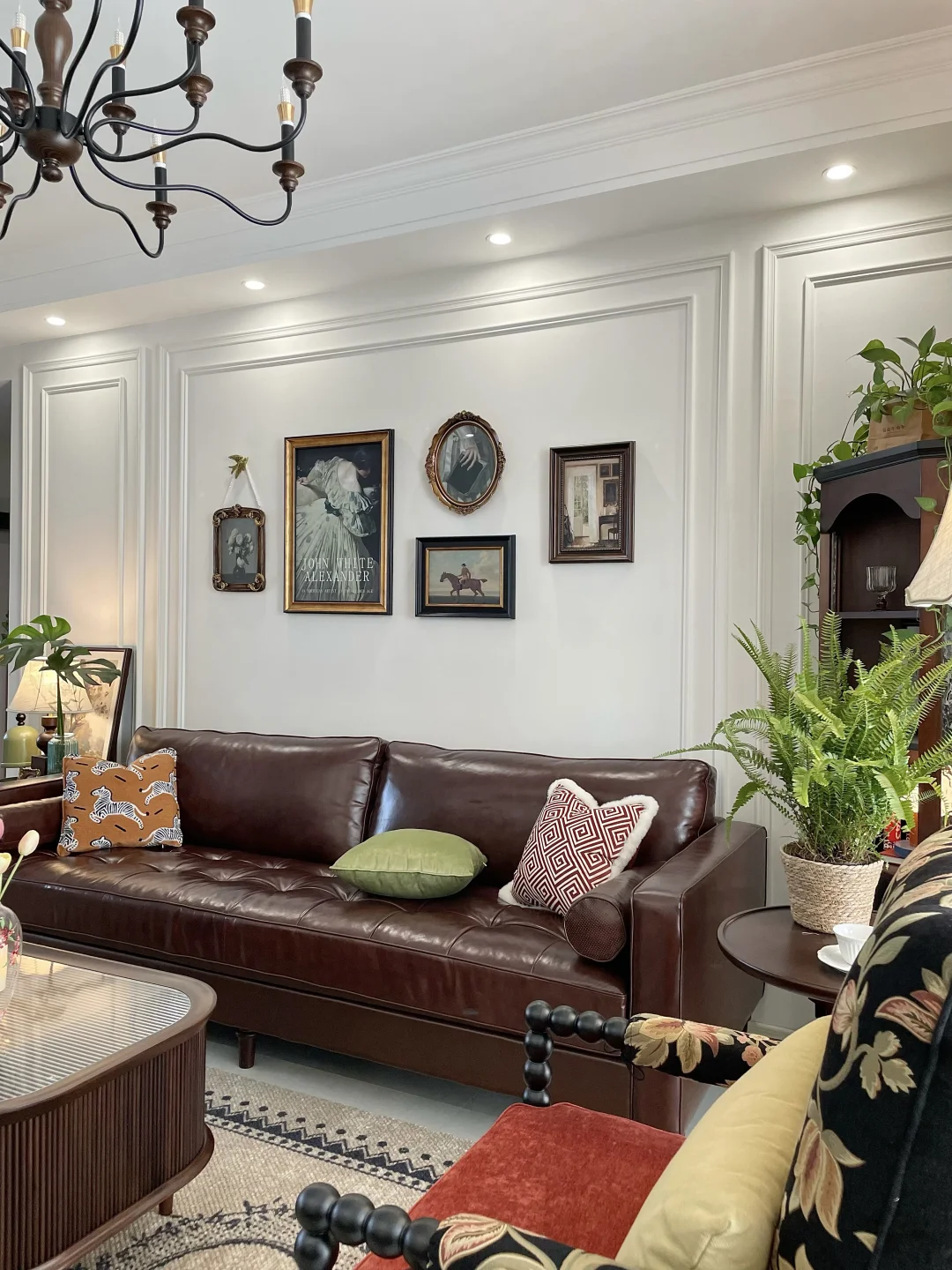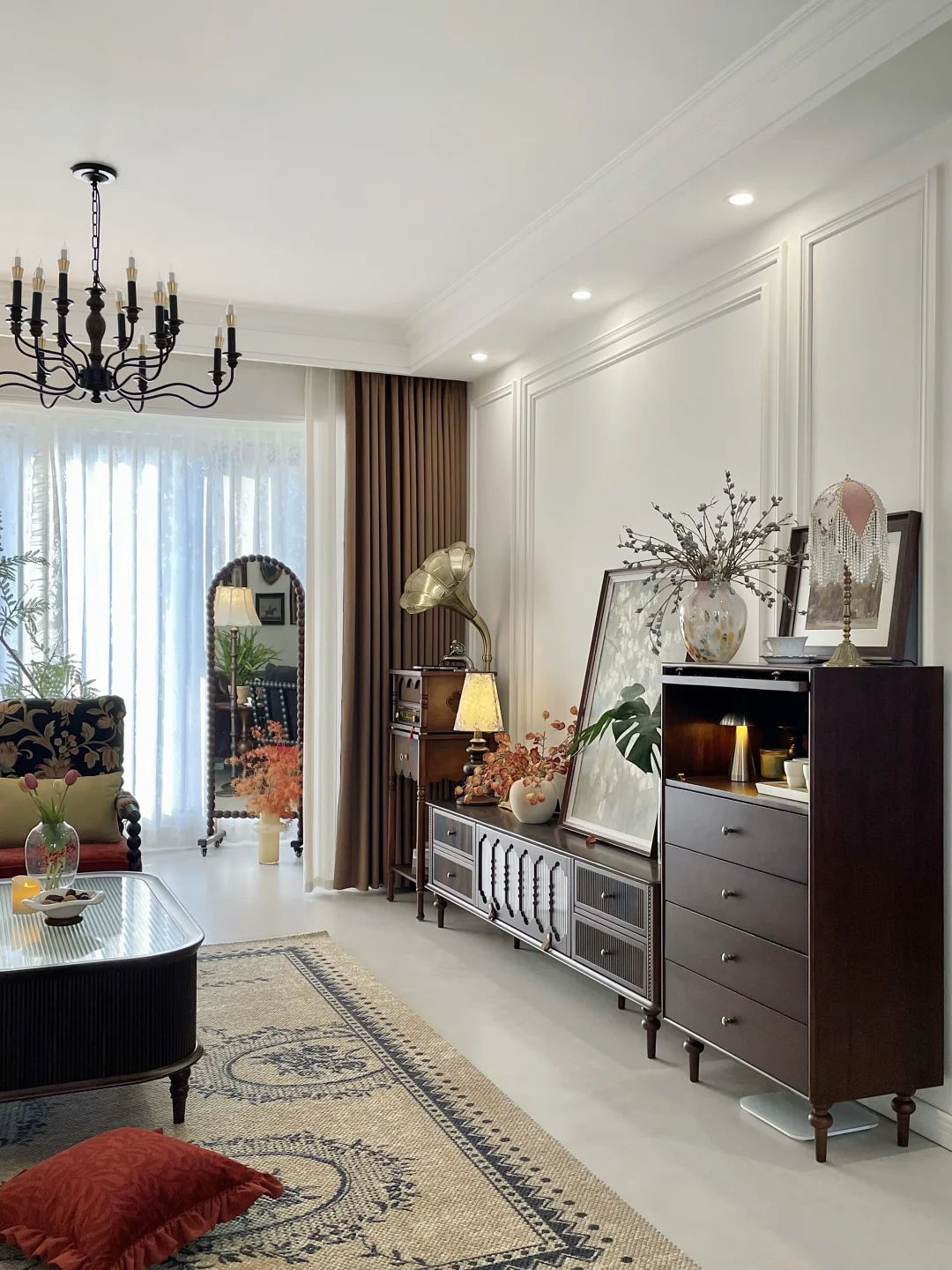 建筑面积120平,套内95平 装修时没找装修公司没请设计师,全程自己盯 没有复杂硬装,墙面通刷乳胶漆 双眼皮吊顶+石膏线背景墙 简简单单,也装出了梦想中的美式复古小家 全屋家具闭眼入了一具一家 风格统一不踩雷,氛围感直接拉满 普通人不会搭配也不怕,放心跟着抄作业~ 🛋️ 沙发墙·客厅C位 深棕色真皮沙发+经典美式拉扣设计 复古韵味十足,经典又稳重 实木框架搭配高密度海绵坐垫扎实又舒服 搭配莫奈·花瓣实木转角柜 玻璃门展示+收纳双在线,颜值实用两不误 📺 电视墙·复古氛围感拉满 两米长莫奈·花瓣电视柜+同系列实木边柜 再配上花好月圆留声机 就是我喜欢的美式复古电影画面感 ☕ 凡尔赛·风琴茶几 精致琴键设计搭配玻璃桌面 复古不沉闷,时尚耐看超适合年轻人 六个抽屉把桌面杂物通通藏起来,整洁又好看 🪑 角落休闲区 黑色繁花珍珠椅,造型精致优雅 搭配小巧实木小圆几 脚下地毯选的温莎古堡系列,配色经典沉稳 随手一拍都是画报即视感,宅家幸福感满满 不用复杂装修,不用花大价钱 普通人家,也能拥有理想中的美式复古小家❤️