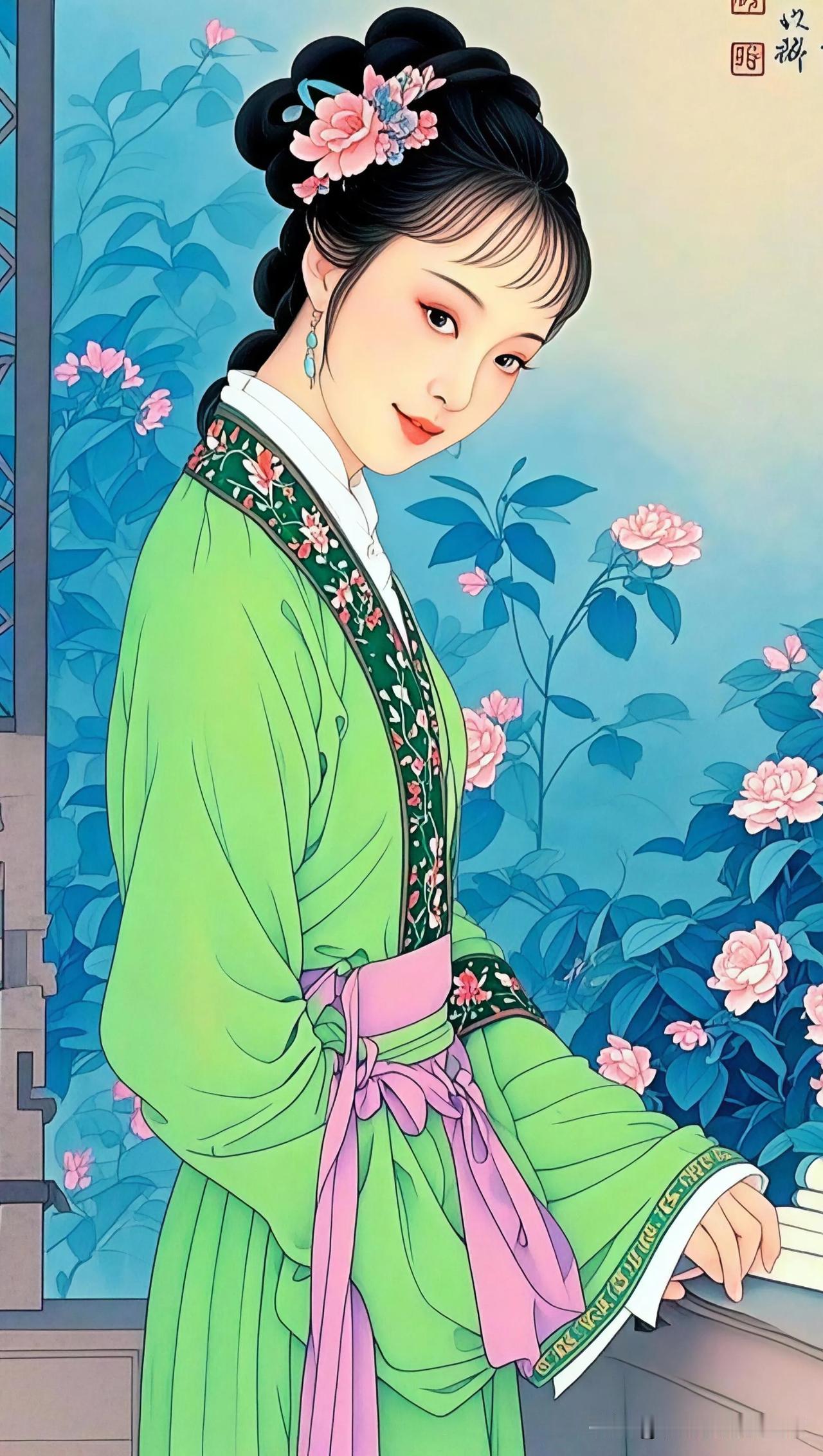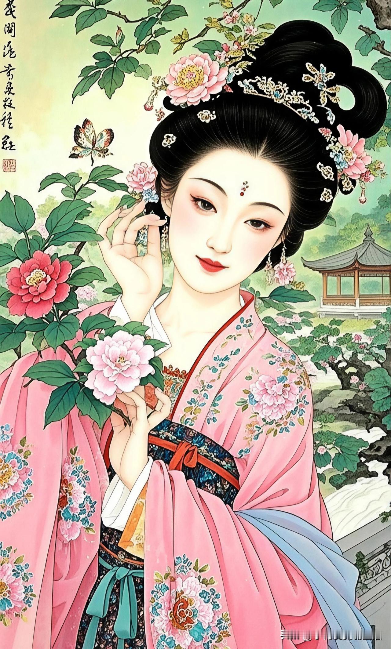 穿越千年的古典美人,手持团扇,静看桃花盛开。