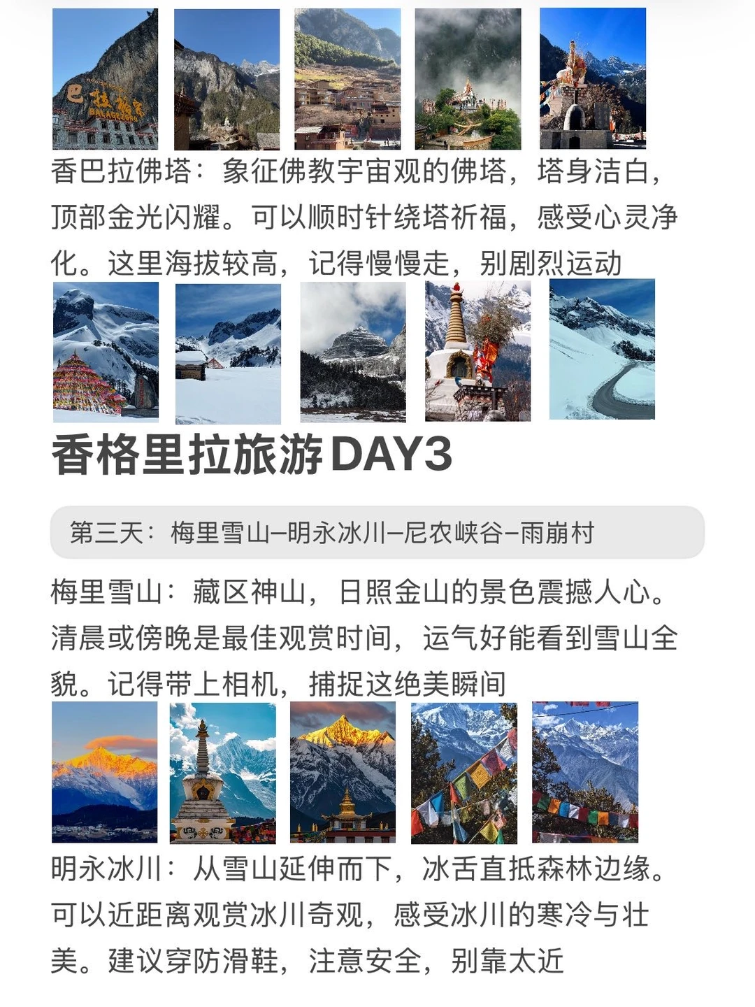 替大家试过了‼️香格里拉真的不适合赶路,每一眼都是治愈!元旦去的第一天就被海拔“教育”了,步数没过万但心跳飙过速…这里把我踩过的坑和私藏的宝藏告诉给大家,愿你们能轻松玩转这座心中的日月 . 💙三日游路线 Day1:松赞林寺→纳帕海→大经幡→独克宗古城 Day2:普达措国家公园→巴拉格宗卓玛拉康→香巴拉佛塔 Day3:梅里雪山→明永冰川→尼农峡谷→雨崩村