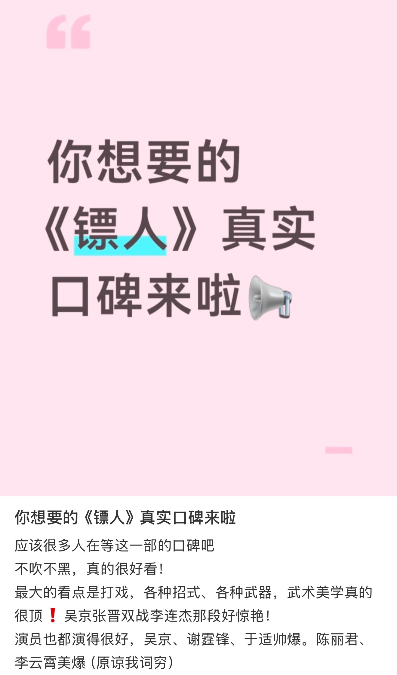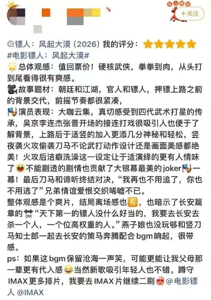 镖人 武侠群像不是那种花里胡哨的特效片,是实打实的真功夫。梁家辉、李连杰、惠英红这些老戏骨一出场,那股武侠味儿就对了;吴京和谢霆锋的打戏也够狠,拳拳到肉,看得人手心冒汗。最让我印象深的是那些年轻演员,不是随便摆摆pose,马术、刀法都是真练的,大漠里摔得浑身是伤也不敷衍,一上马一执刀,真的像从漫画里走出来的侠客。故事也不只是打打杀杀,镖队里的兄弟情、刀马对小七的护犊子,还有“镖在人在”的死规矩,都挺戳人的。看完就觉得,这才是我们想看的江湖——有硬气,也有温度。