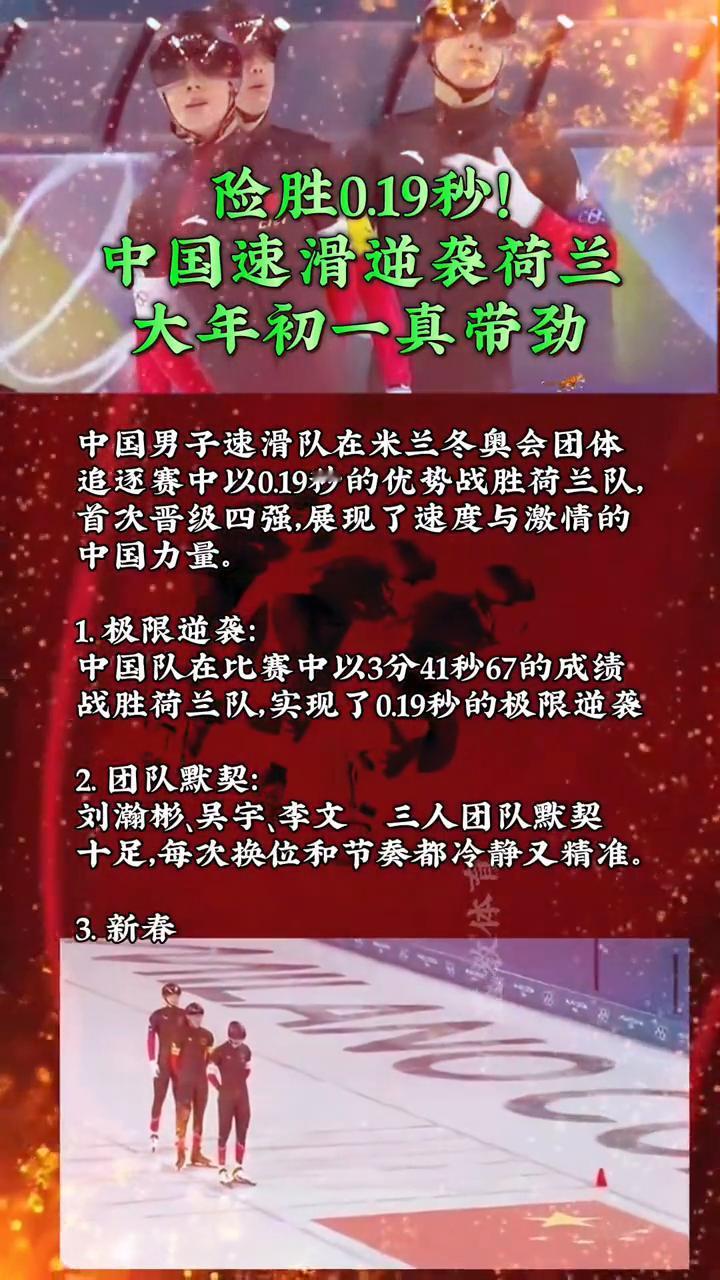 险胜0.19秒!中国速滑通袭荷兰,大年初一真带劲! 中国男子速滑队在米兰冬奥会团体追逐赛中以0.19秒的优势战胜荷兰队,首次晋级四强,展现了速度与激情的中国力量。 ·1.极限逆袭:中国队在比赛中以3分41秒67的成绩战胜荷兰队,实现了019秒的极限逆袭。 ·2.团队默契:刘瀚彬、吴宇、李文三人团队默契十足,每次换位和节奏都冷静又精准。 ·3.新春仪式:比赛恰逢中国农历新年第一天,中国队希望用表现为全国人民送上特别的"春晚"。
