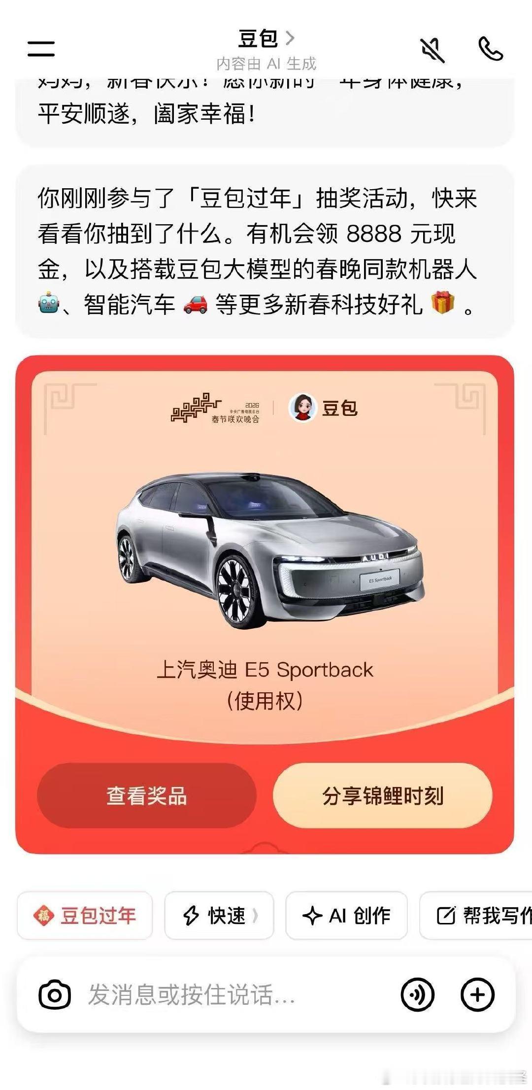 年夜饭上抽中年度猎装轿跑引爆全网今年春晚的抽奖属实是吸引到我了!🎁豆包×央视春晚直接把奥迪E5 Sportback送上科技大礼包C位,场面真是“壕”出圈了,甚至连见惯大场面的各路明星都在线催更:加场!加场!🔥