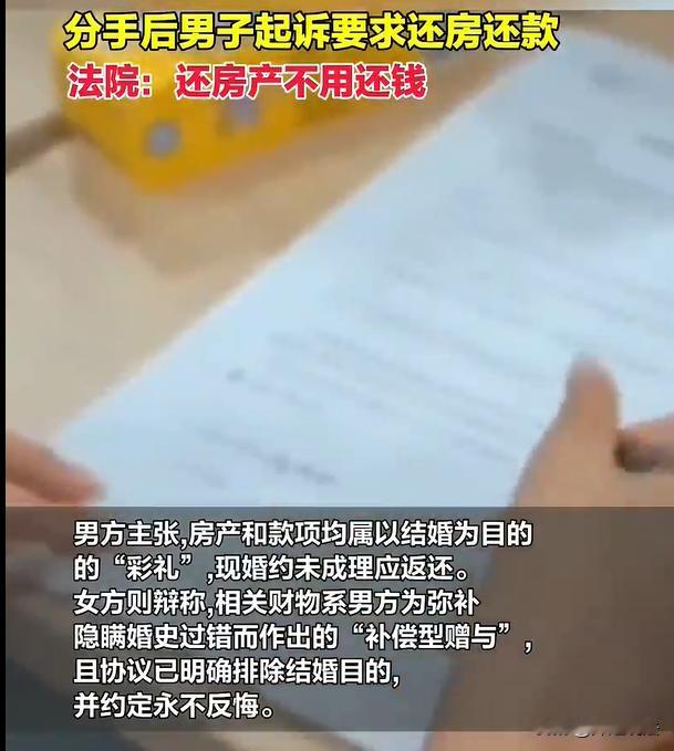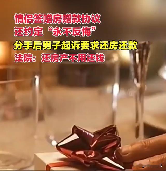 大连,一对男女在相亲平台相识,处对象之后确定要结婚,女孩跟男方说,想要签订一个协议,叫作“永不后悔无偿赠送”条约。就是确定恋爱之后,男方需要赠送名下唯一的房产给女方,同时还要给10万元给女方,还约定了一条,这些赠送,不能以结婚作为前提。意思就是,即便之后分手了,没有结婚了,这些赠与也不能撤销。没成想,这俩人后来还真分手了,男子则主张要求女方退还。 红星新闻报道了这则新闻。 谈恋爱还可以签订协约绑架彼此吗?这对情侣的做法,就有些太过于矫揉造作了。 张先生跟于女士两个人通过相亲平台认识,在认识之后,二人见面,互相感觉还挺合适,就确定了恋爱关系。 确定关系之后,情侣关系快速升温,两个人相处起来也是愈发甜蜜。 但是女方后来突然想到一出,她有些患得患失,想要跟男友签订一份“不平等”的协约。 于女士认为,自己作为女方,在跟男子相处之后,难免会吃亏,所以,一直在向男方索要钱财。 先是让男方无偿赠与自己一套房子,一定要写上自己的名字。 不仅如此,还想要张先生无偿赠与自己10万元,可以作为之后结婚的彩礼钱。 赠送了这两样资产之后,于女士还让张先生签订了一个条约,确定一下,这些赠与不能以结婚作为前提。 意思就是,即便之后两个人分手了,于女士也不需要将房屋返还,包括10万元的彩礼也是,不需要偿还给男方。 之后,张先生就按照约定,将房子过户给了于女士。 房子过户之后,张先生继续履约,将10万元陆陆续续的打给了女方。并且,后来还多打了2万多给到女方。 转账完毕之后,女方也向男方转账了1万7千多,代表着互相赠送礼物。 本来以为这样的互相赠送,可以挽留彼此的情感。没想到,两个人相处了还没一两年,就开始闹矛盾了。 就是因为购买车辆的问题,两个人因为买车涉及到金钱这一块,于女士让张先生继续拿钱,但是表示暂时也没那么多钱了。 这样,二人就产生了矛盾,后来吵得越来越厉害,两个人直接就闹分手了。 分手之后,张先生就要求女友将之前所有的转账都还给他,另外,房产也需要及时返还。 而这个时候,于女士就不答应了。她拿出了那个“不平等条约”,上面签订了“永不后悔”。 工作人员审查的时候发现,上面确实写了:本次赠与为无偿赠与,无任何的附加条件,也不以结婚作为前提。 这个案件,相关部门是怎么审理的呢? 张先生在转账的时候,时机不对,基本上都是情人节的转账,有9999元,1314元等,含有特殊含义,这些转款高达8万元,于女士不需要返还。 而房产其实已经成为了“彩礼”,需要于女士返还。 虽然有书面约定,但是房产属于重大房产,房产性质特殊,并且还是张先生名下的唯一房产,结合公平的原则,考虑到张先生的经济状况,如果真的履约则又是公正。因此判决于女士,房产需要返还给人家。 有一点需要注意的是,就是恋爱期间的采取,需要谨慎对待,要明确钱款的使用意图,避免后续的纠纷。 本案释法: 恋爱时期男子约定将名下唯一的房产赠与女方,还签订了永不后悔的协约。后期分手后,男方可以主张要求女方将房屋还给自己吗? 根据《民典法》规定,如果双方在恋爱期间,男方无偿赠与房产跟资产,之后还签订了协议永不后悔,男方完全具备民事行为能力,自愿签署,一般来说,相关部门会尊重其意思,给与支持。 但是,如果款项内容,一直是以结婚的目的进行,虽然之后分手有反悔的情况,房产、资产均会被认为是“彩礼”,这类约定违背了公序良俗,本质诚实守信的原则,法律则会有所倾斜。 加上本案中男子名下唯一的房子赠与了女子,之后自己却经济薄弱,生活水平下降,为了彰显公平,相关部门判定的时候,会主张女方要返还房产。 转账这一块,在恋爱时期,如果转账有特殊含义的数字,这些钱款则不需要返还。如果直接银行转账10万,这笔则可以依法追偿。 不过,这个女的要这么多资产,还要签订霸王条约,实在有些过于可耻了,这个吃相确实难看。 对此,大家怎么看。