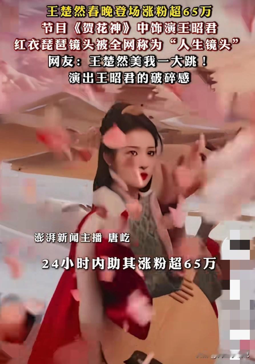 今年春晚,最让人挪不开眼的,莫过于王楚然扮演的王昭君。太美了,实在太美了!一袭红衣映着漫天落雪,怀抱琵琶,眉眼间藏着淡淡愁绪,那股清冷又深情的破碎感,瞬间戳中无数人的心。 在《贺花神》短短几十秒的镜头里,她没有一句台词,只凭一个抬眸、一次回望,就把昭君出塞的不舍、坚韧与家国情怀演绎得淋漓尽致。央视镜头不加修饰,却更衬得她眉目如画、仪态端庄,红衣似火,白雪清绝,每一帧都像从古画里走出来的绝色佳人,被网友直呼这是“人生镜头”。 谁也没想到,这惊鸿一瞥,让王楚然一夜之间吸粉65万,话题刷屏全网。有人赞她是天选古人,有人说她把古典美人的破碎感演到了极致。她不靠夸张造型,不靠浓妆艳抹,仅凭气质与眼神,就成为本届春晚最出圈、最让人难忘的风景。 真正的美,从不是刻意张扬,而是一眼万年。王楚然的王昭君,美在风骨,美在神韵,美在那一抹让人心疼又心动的破碎感。这一幕,注定成为春晚舞台上,久久难忘的经典。