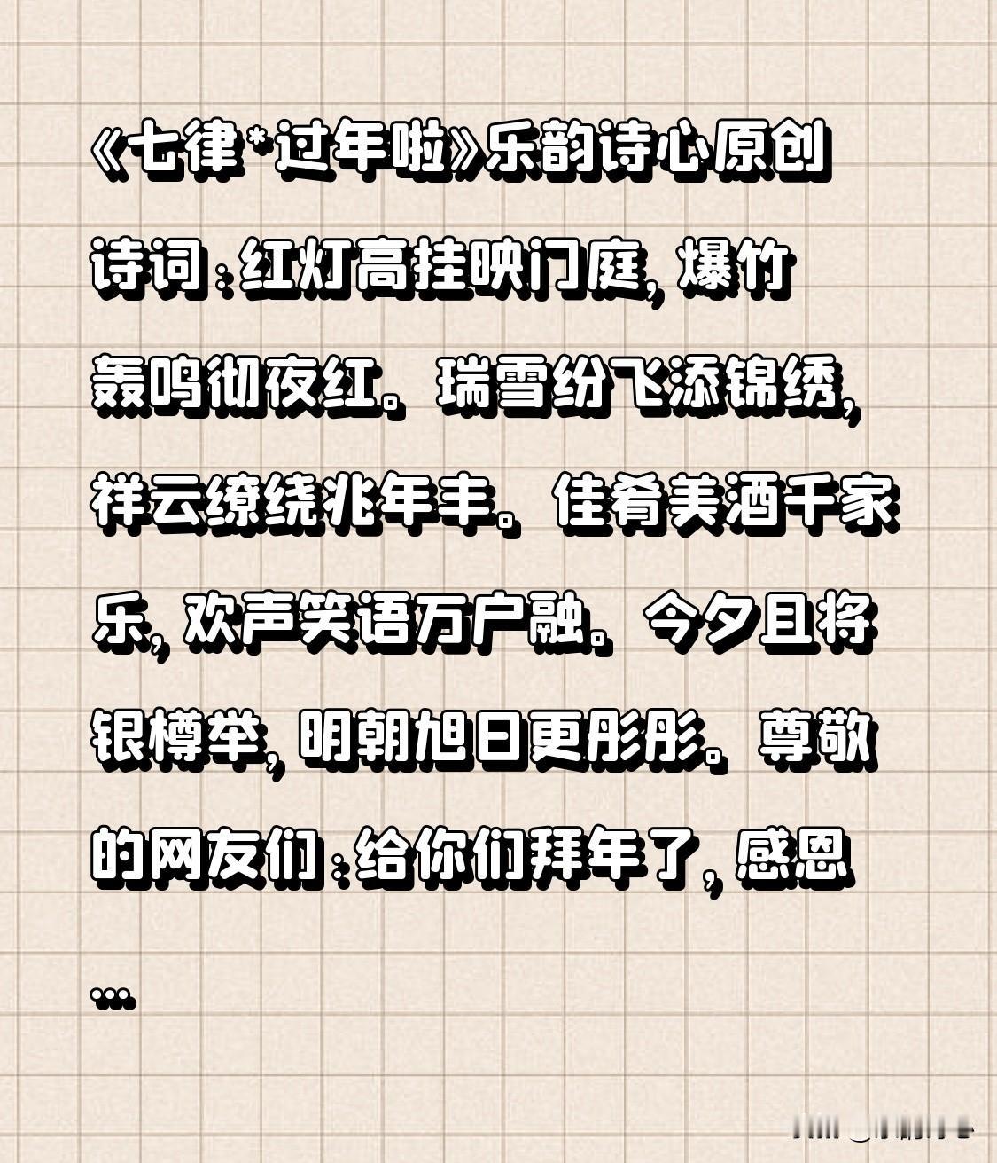 《七律*过年啦》乐韵诗心原创诗词: 红灯高挂映门庭, 爆竹轰鸣彻夜红。 瑞雪纷飞添锦绣, 祥云缭绕兆年丰。 佳肴美酒千家乐, 欢声笑语万户融。 今夕且将银樽举, 明朝旭日更彤彤。 尊敬的网友们:给你们拜年了。感恩感谢所有网友们的支持、信任与陪伴,谢谢你们的点赞、评论,特别是陪伴我近两年的铁粉们,你们的支持和信任是激励我前行的动力,也是我努力进步的方向。 最后祝大家马年吉祥!阖家幸福团圆!心想事成!万事如意!